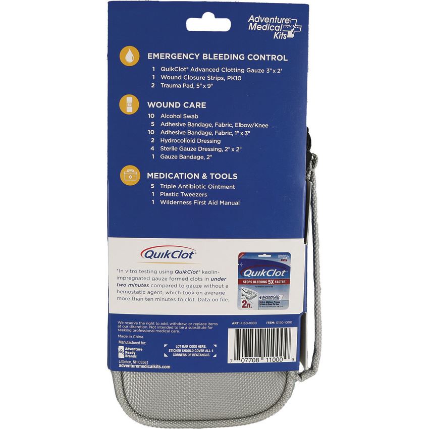 Model/Item/Part Number - AD01501000. Adventure Medical Accident Pack w/ QuikClot. Includes: (1) QuikClot Advanced Clotting Gauze, 3" x 2"; (1) Wound Closure Strips, pk10; (2) Trauma Pad, 5" x 9"; (10) Alcohol Swab; (5) Adhesive Bandage, Fabric elbow/knee; (10) Adhesive Bandage, Fabric 1" x 3"; (2) Hydrocolloid Dressing; (4) Sterile Gauze Dressing; 2" x 2"; (1) Gauze Bandage, 2"; (5) Triple Antibiotic Ointment; (1) Plastic Tweezers; (1) Wilderness First Aid Manual; Zippered storage case. Hang packaged. Made in USA.