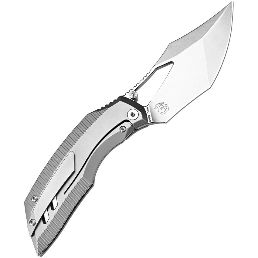 Model/Item/Part Number - ATZ1887GGY. Artisan Dark Wing Framelock Knife Gray. 4.38" (11.13cm) closed. 3.63" (9.22cm) stonewash finish S35VN stainless modified tanto blade. Gray titanium handle. Thumb stud. Thumb pull. Pocket clip. Extended tang. Black nylon zippered storage case. Boxed. Made in China.
