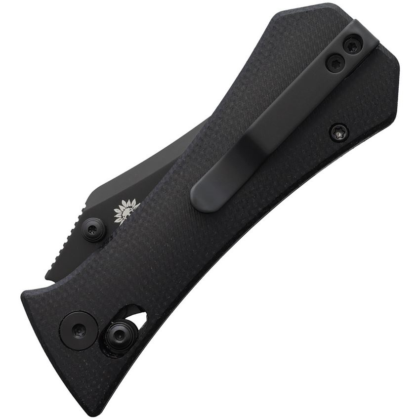 Model/Item/Part Number - AUX004BLK. Auxiliary Pocket Bowie Crossbar Lock Knife. 3.75" (9.53cm) closed. 2.75" (6.99cm) black finish 14C28N Sandvik stainless bowie blade. Black canvas micarta handle. Thumb stud. Pocket clip. Black G10 backspacer. Boxed. Made in China.
