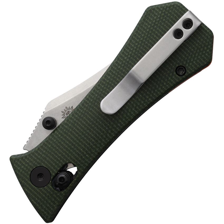 Model/Item/Part Number - AUX004GRN. Auxiliary Pocket Bowie Crossbar Lock Knife. 3.75" (9.53cm) closed. 2.75" (6.99cm) stonewash finish 14C28N Sandvik stainless bowie blade. Green canvas micarta handle. Thumb stud. Pocket clip. Orange G10 backspacer. Boxed. Made in China.