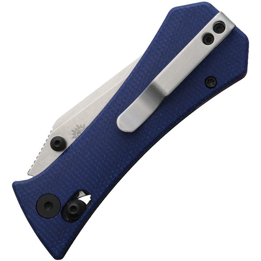 Model/Item/Part Number - AUX005BLU. Auxiliary Coffin Crossbar Lock Knife Blu Tan. 3.75" (9.53cm) closed. 2.75" (6.99cm) stonewash finish 14C28N Sandvik stainless tanto blade. Blue canvas micarta handle. Thumb stud. Pocket clip. Red G10 backspacer. Boxed. Made in China.