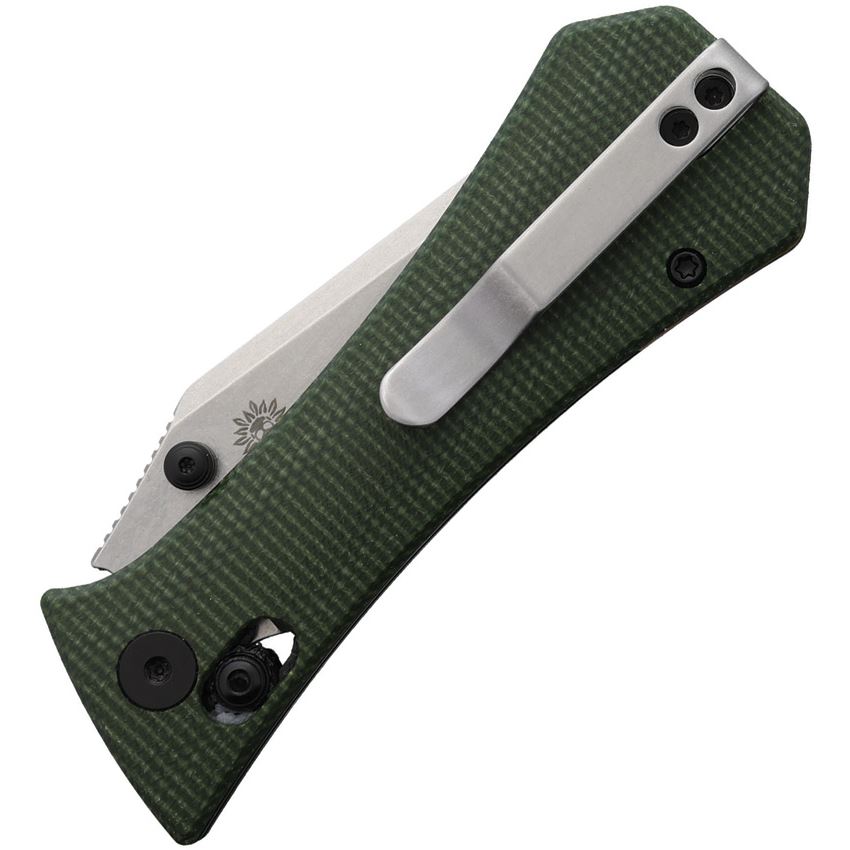 Model/Item/Part Number - AUX005GRN. Auxiliary Coffin Crossbar Lock Knife Grn Tan. 3.75" (9.53cm) closed. 2.75" (6.99cm) stonewash finish 14C28N Sandvik stainless tanto blade. Green canvas micarta handle. Thumb stud. Pocket clip. Orange G10 backspacer. Boxed. Made in China.