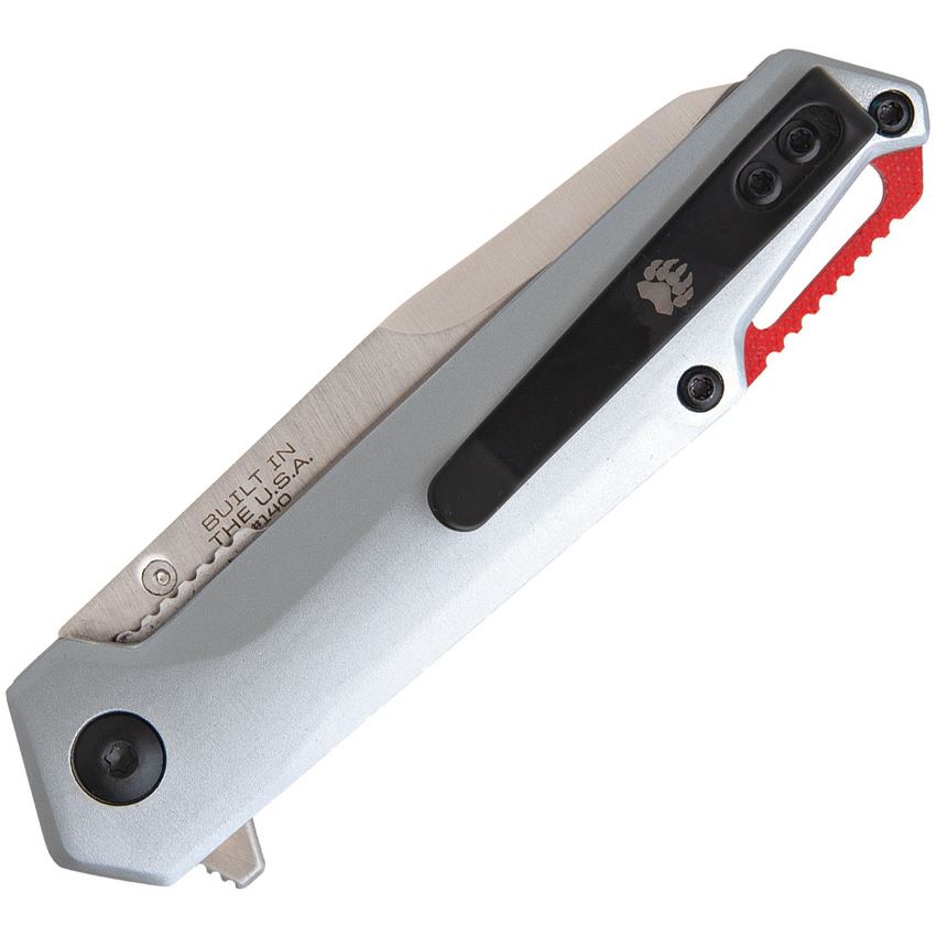 Model/Item/Part Number - BC71140. Bear & Son Linerlock Knife Gray Alum. 4" (10.16cm) closed. 3" (7.62cm) satin finish 440 stainless drop point blade. Gray aluminum handle. Extended tang. Lanyard hole. Pocket clip. Thumb stud. Red G10 backspacer. Boxed with hanging tab. Made in USA.