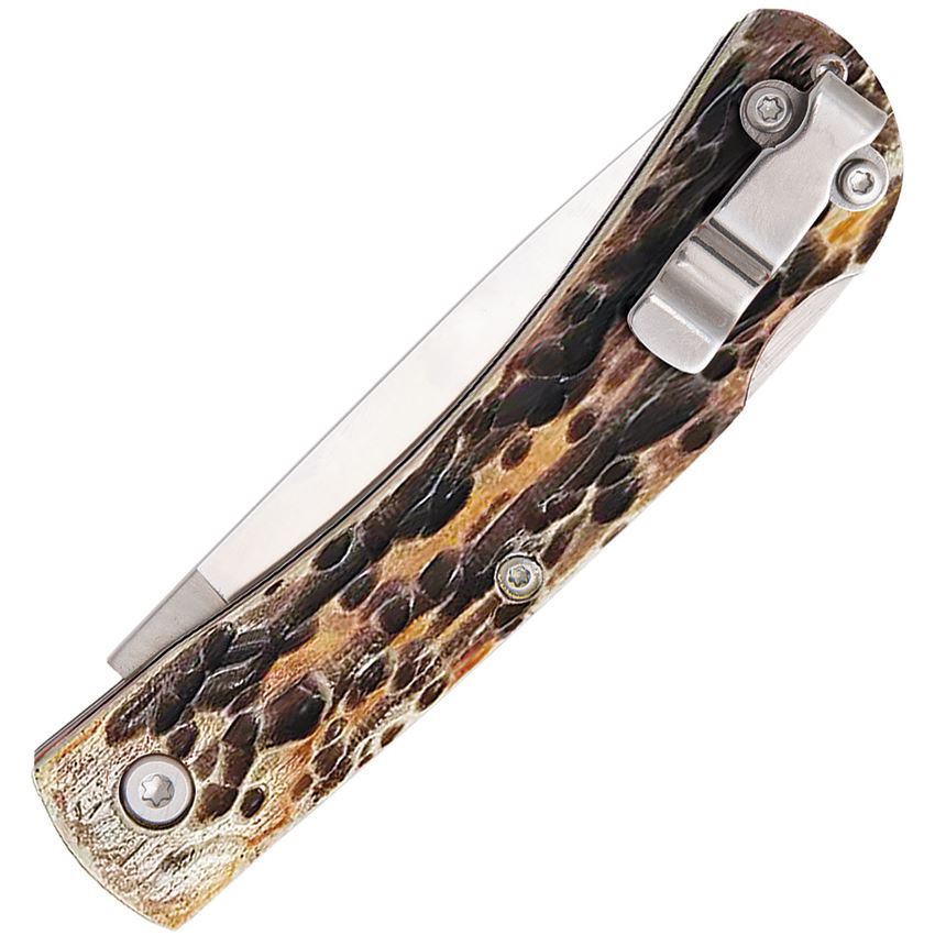 Model/Item/Part Number - BC537L. Bear & Son Lockback India Stag Bone. 3.63" (9.22cm) closed. 2.63" (6.68cm) satin finish stainless drop point blade. India stag bone handle. Boxed. Made in USA.