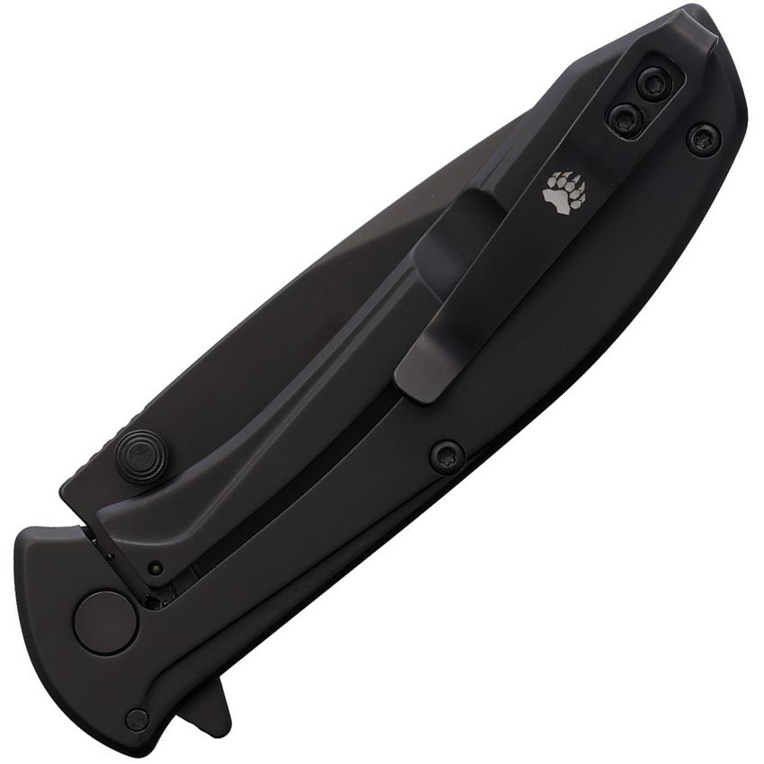Model/Item/Part Number - BC112ABK. Bear & Son Framelock Knife Assist Open Black. 4" (10.16cm) closed. 2.88" (7.32cm) black finish 440 stainless drop point blade. Black stainless handle. Extended tang. Thumb stud. Pocket clip. Boxed. Made in USA.