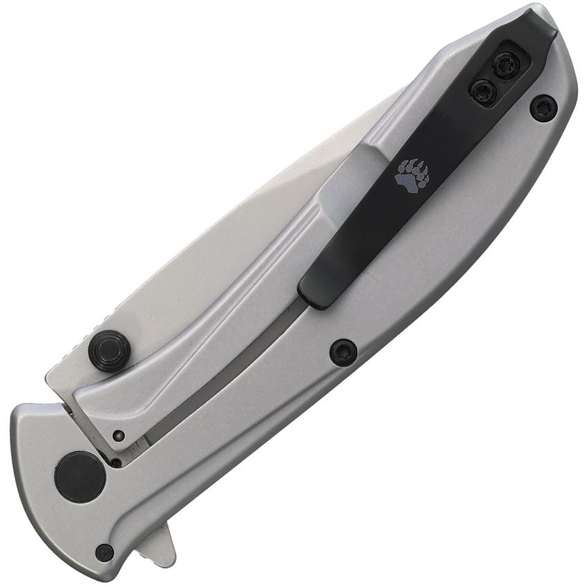 Model/Item/Part Number - BCU112AGF. Bear & Son Framelock Knife Assist Open Gadsden. Assisted opening. 4.13" (10.49cm) closed. 2.88" (7.32cm) bead blast finish stainless drop point blade. Stainless handle with bead blast finish stainless back handle. Thumb stud. Extended tang. Pocket clip. Gadsden Flag handle artwork. Boxed. Made in USA.