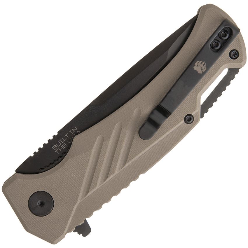 Model/Item/Part Number - BC71139. Bear & Son Linerlock Knife Assist Open Tan. Assisted opening. 4.5" (11.43cm) closed. 3.38" (8.59cm) black finish 440 stainless tanto blade. Tan G10 handle. Extended tang. Lanyard hole. Pocket clip. Boxed with hanging tab. Made in USA.
