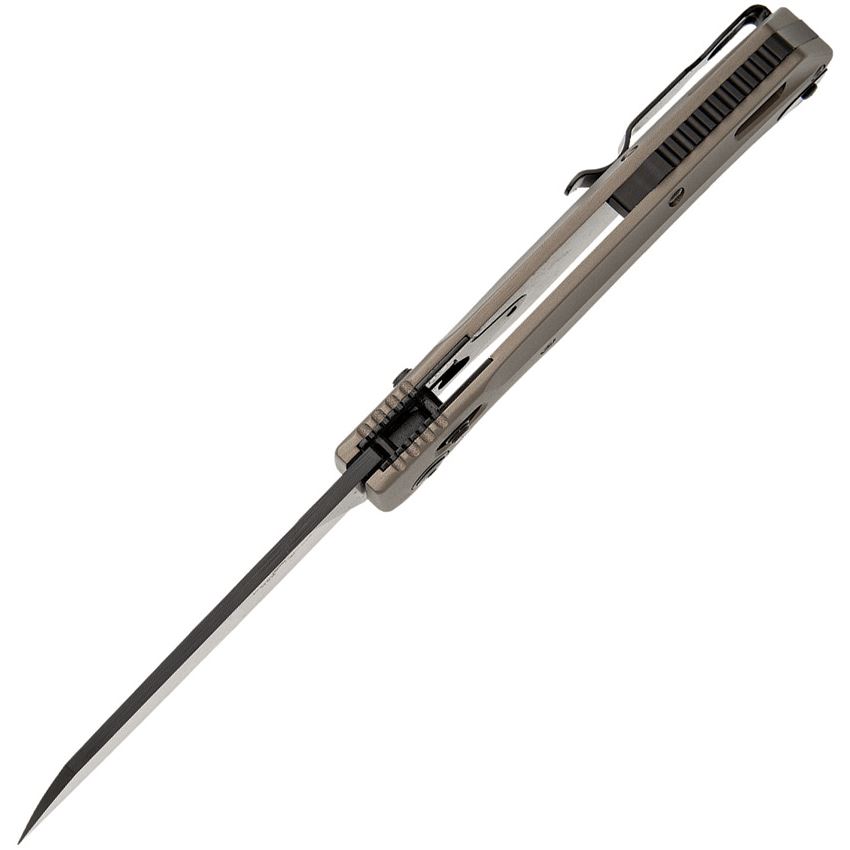 Model/Item/Part Number - BCAC2200ALDEB. Bear & Son Auto Katakt III Slide Lock DE. Automatic opening. 4.88" (12.4cm) closed. 3.5" (8.89cm) black finish Bohler M390 stainless Wharncliffe blade. Flat Dark Earth aluminum handle. Lanyard hole. Pocket clip. Boxed. Made in USA.