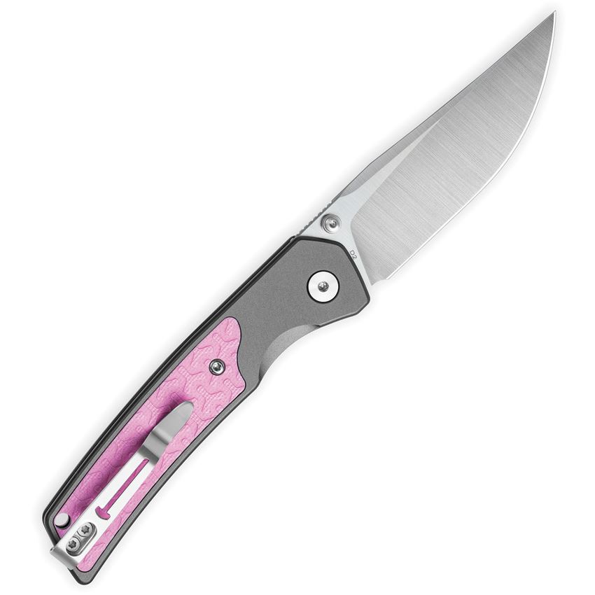 Model/Item/Part Number - BTKMK16B. Bestech Icebreaker Button Lock Gry/Pnk. 4.25" (10.8cm) closed. 3.13" (7.95cm) satin finish D2 tool steel drop point blade. Gray matte finish aluminum handle with pink G10 inlay. Thumb stud. Lanyard hole. Pocket clip. Boxed. Made in China.