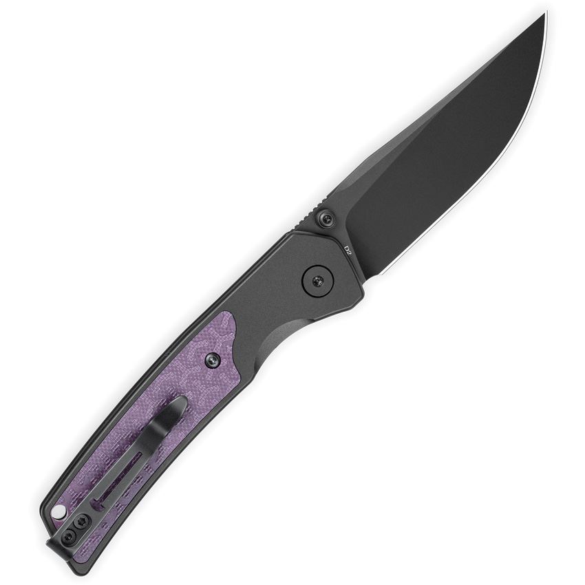 Model/Item/Part Number - BTKMK16C. Bestech Icebreaker Button Lock Blk/Prp. 4.25" (10.8cm) closed. 3.13" (7.95cm) black PVD coated D2 tool steel drop point blade. Black matte finish aluminum handle with purple G10 inlay. Thumb stud. Lanyard hole. Pocket clip. Boxed. Made in China.