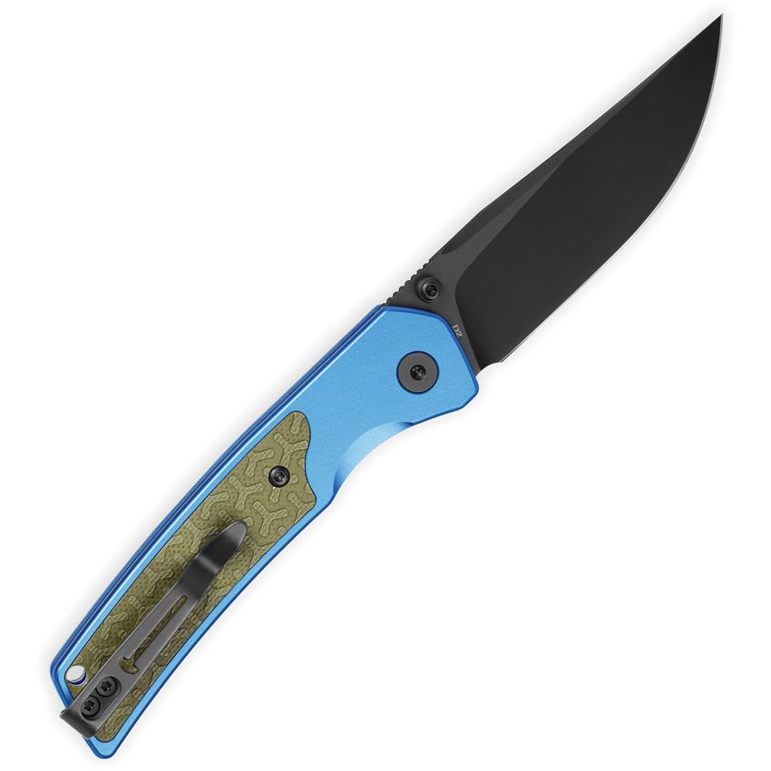 Model/Item/Part Number - BTKMK16E. Bestech Icebreaker Button Lock Blu/OD. 4.25" (10.8cm) closed. 3.13" (7.95cm) black PVD coated D2 tool steel drop point blade. Blue matte finish aluminum handle with OD green G10 inlay. Thumb stud. Lanyard hole. Pocket clip. Boxed. Made in China.