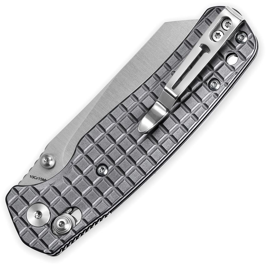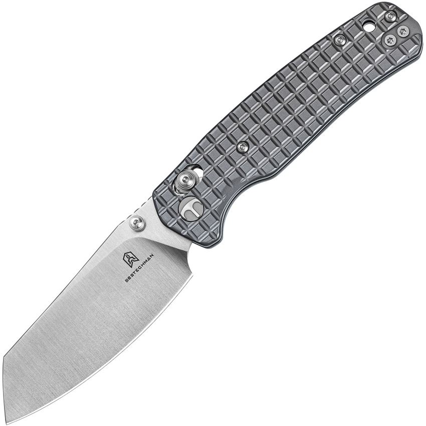 Model/Item/Part Number - BTKMK06S1. Bestech Cicada's Wing B-Lock Frag. 4" (10.16cm) closed. 3.13" (7.95cm) satin finish 10Cr15CoMoV stainless reverse tanto blade. Gray frag pattern stainless handle. Thumb stud. Lanyard hole. Pocket clip. Boxed. Made in China.