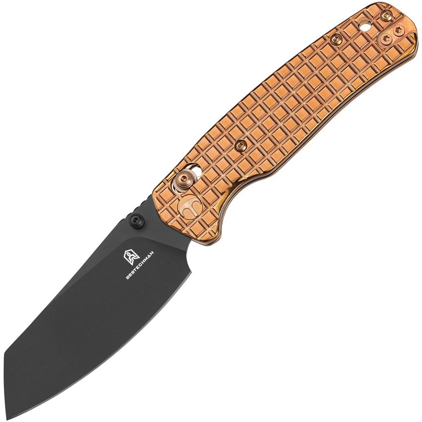 Model/Item/Part Number - BTKMK06S4. Bestech Cicada's Wing B-Lock Frag. 4" (10.16cm) closed. 3.13" (7.95cm) black PVD coated 10Cr15CoMoV stainless reverse tanto blade. Bronze frag pattern stainless handle. Thumb stud. Lanyard hole. Pocket clip. Boxed. Made in China.