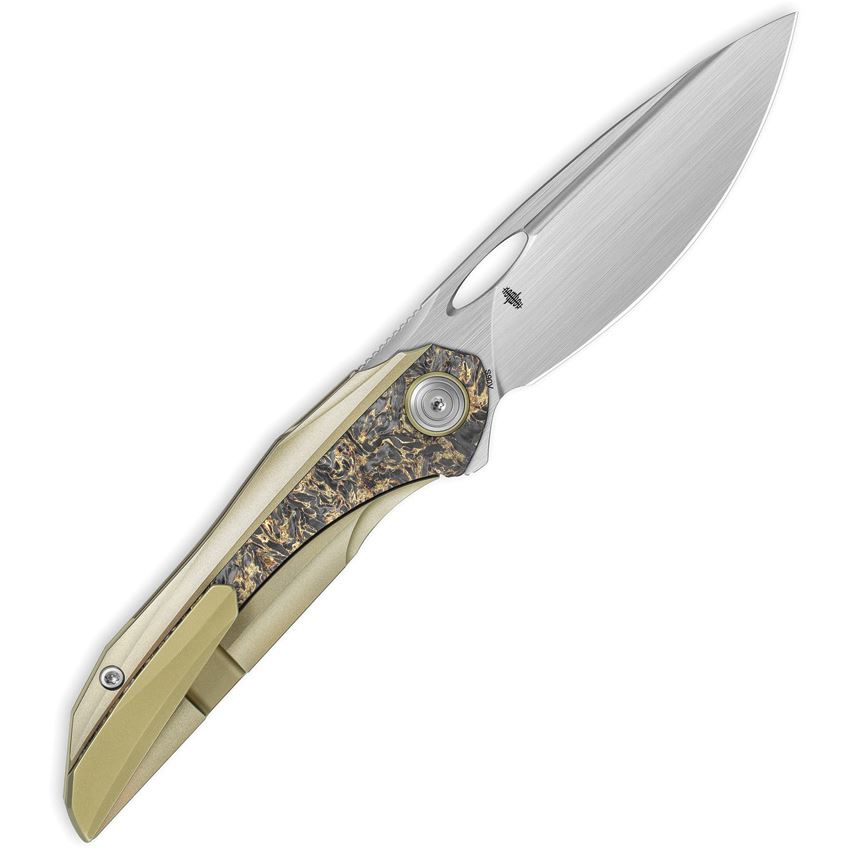 Model/Item/Part Number - BTKT2601C. Bestech SENU Framelock Knife Ti/Fat Carbon. 4.5" (11.43cm) closed. 3.5" (8.89cm) satin finish S90V steel drop point blade. Bronze titanium handle with Fat carbon fiber inlay. Extended tang. Thumb pull. Pocket clip. Black nylon pouch. Boxed. Made in China.