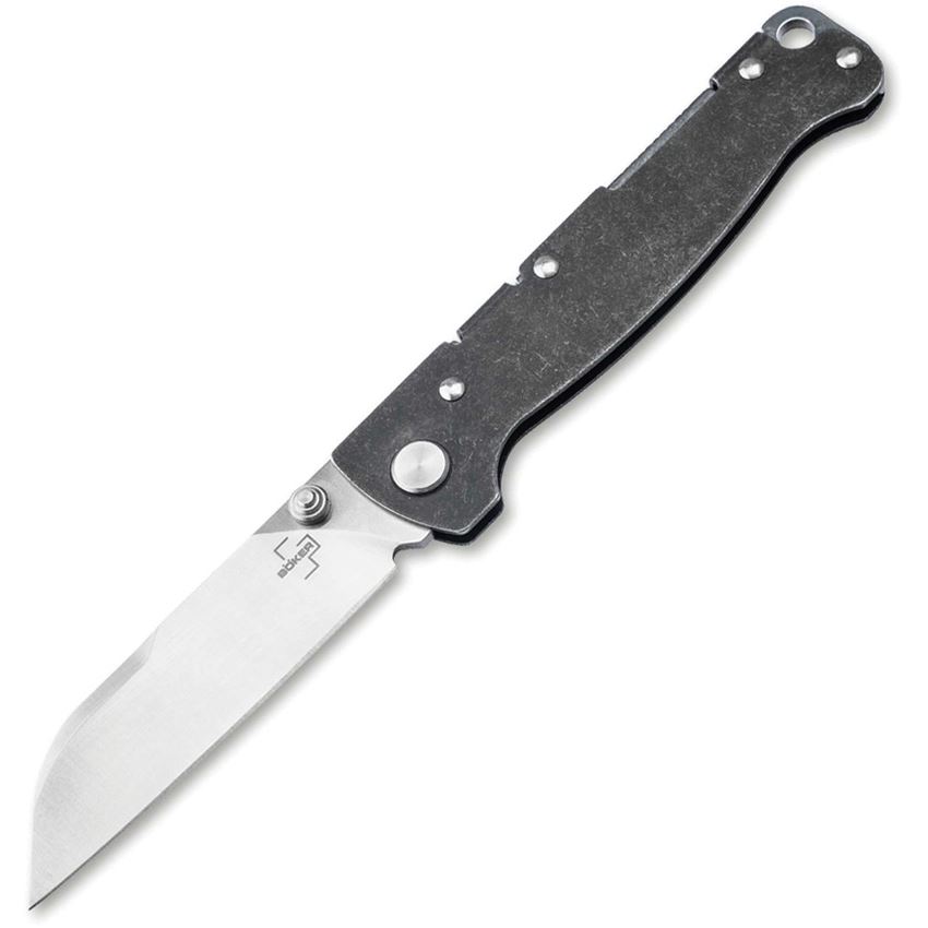 Model/Item/Part Number - BOP01BP0066. Boker Plus Atlas Lockback Sheepsfoot. 3.75" (9.53cm) closed. 2.88" (7.32cm) satin finish D2 tool steel sheepsfoot blade. Black stonewash finish stainless handle. Thumb stud. Lanyard hole. Pocket clip. Boxed. Made in China.