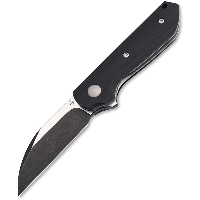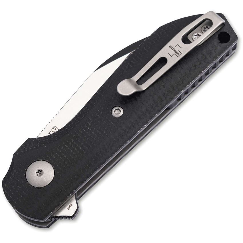 Model/Item/Part Number - BOP01BP0071. Boker Plus Corvus Linerlock Knife. 3.75" (9.53cm) closed. 2.75" (6.99cm) black stonewash and satin finish Nitro V steel Wharncliffe blade. Black micarta handle. Extended tang. Lanyard hole. Pocket clip. Boxed. Made in China.