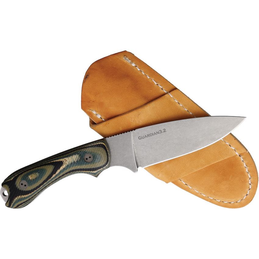 Model/Item/Part Number - BRAD32FH128A. Bradford Guardian 3.2 3D Forest G-Wood. 7.13" (18.11cm) overall. 3.5" (8.89cm) stonewash finish AEB-L stainless blade. Forest green G-Wood handle. Full, extended tang. Lanyard hole. Brown leather belt sheath. Boxed. Made in USA.