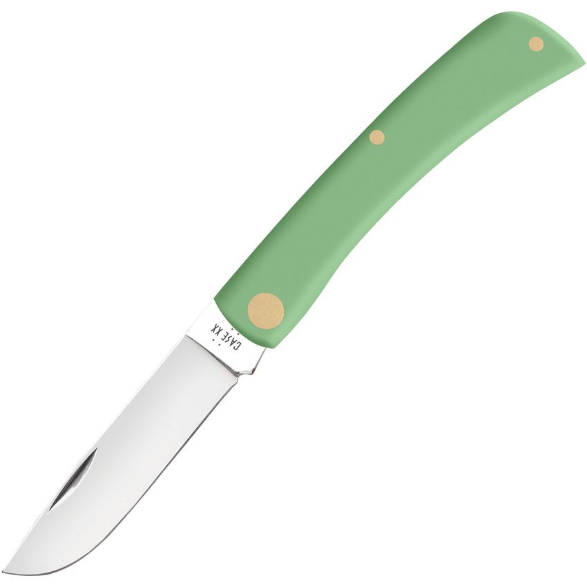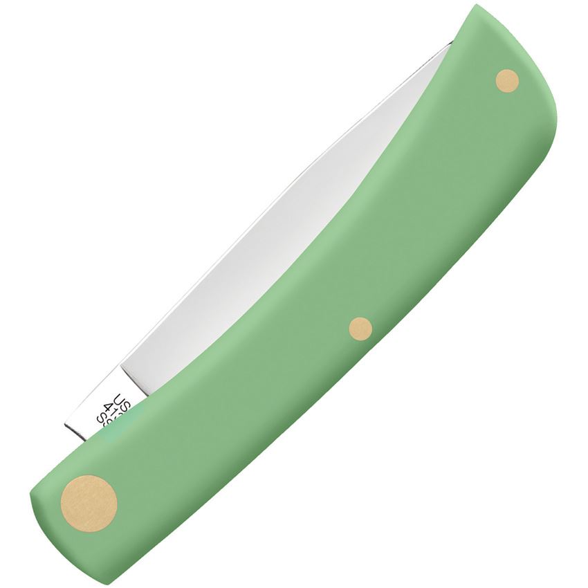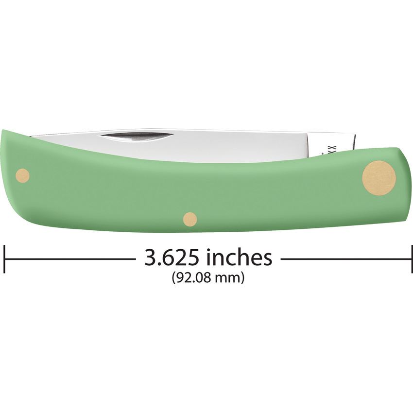 Model/Item/Part Number - CA63834. Case XX Sod Buster Jr Mint Green. 4137 SS pattern. 3.63" (9.22cm) closed. Mirror finish stainless skinner blade. Mint Green smooth synthetic handle. Boxed. Made in USA.