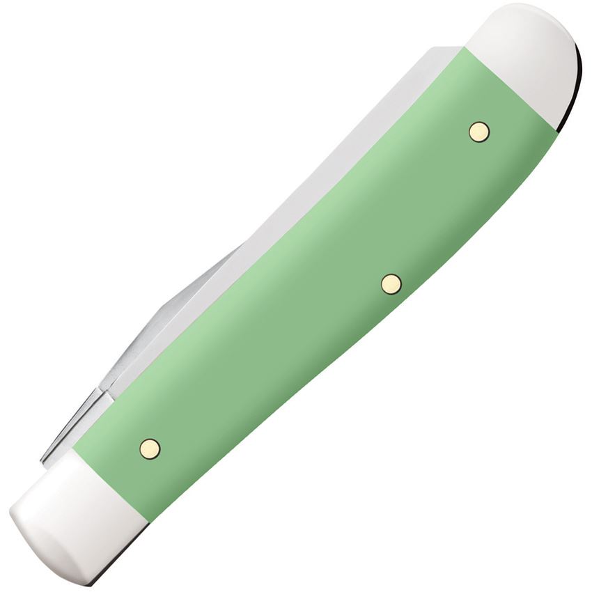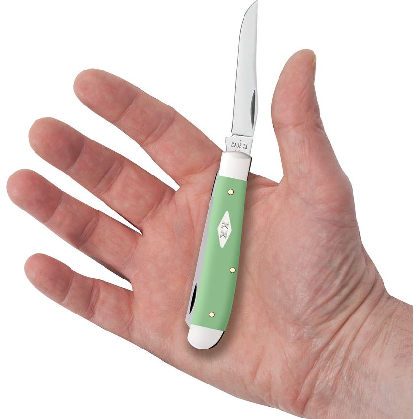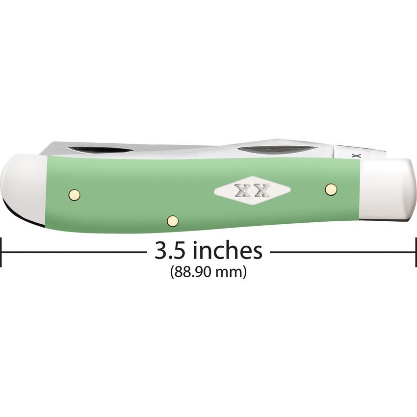 Model/Item/Part Number - CA63831. Case XX Mini Trapper Mint Green. 4207 SS pattern. 3.5" (8.89cm) closed. Mirror finish stainless clip and spey blades. Mint Green smooth synthetic handle. Nickel silver bolster(s). Inlay shield. Boxed. Made in USA.