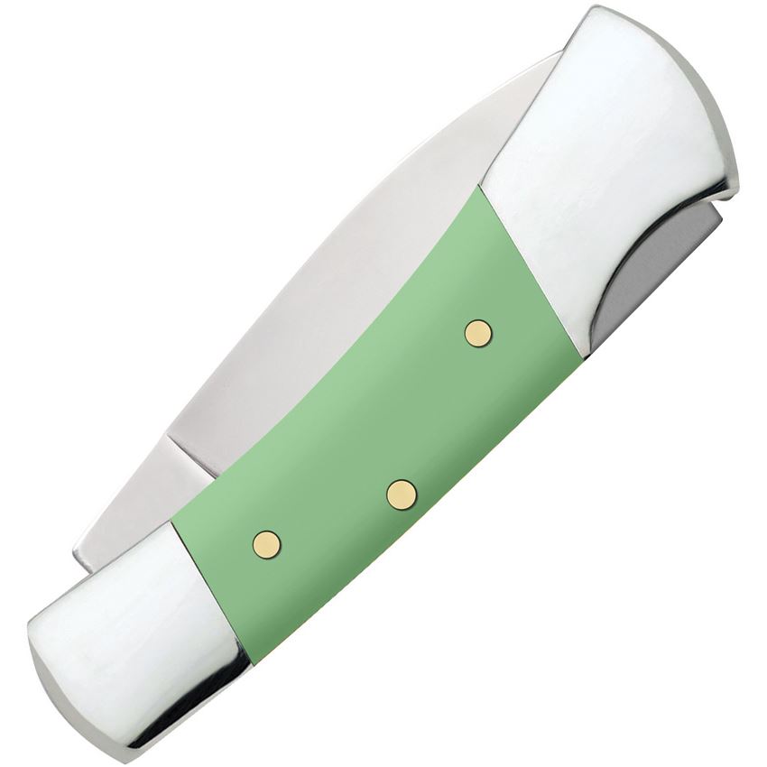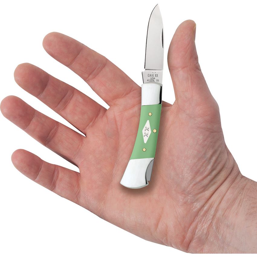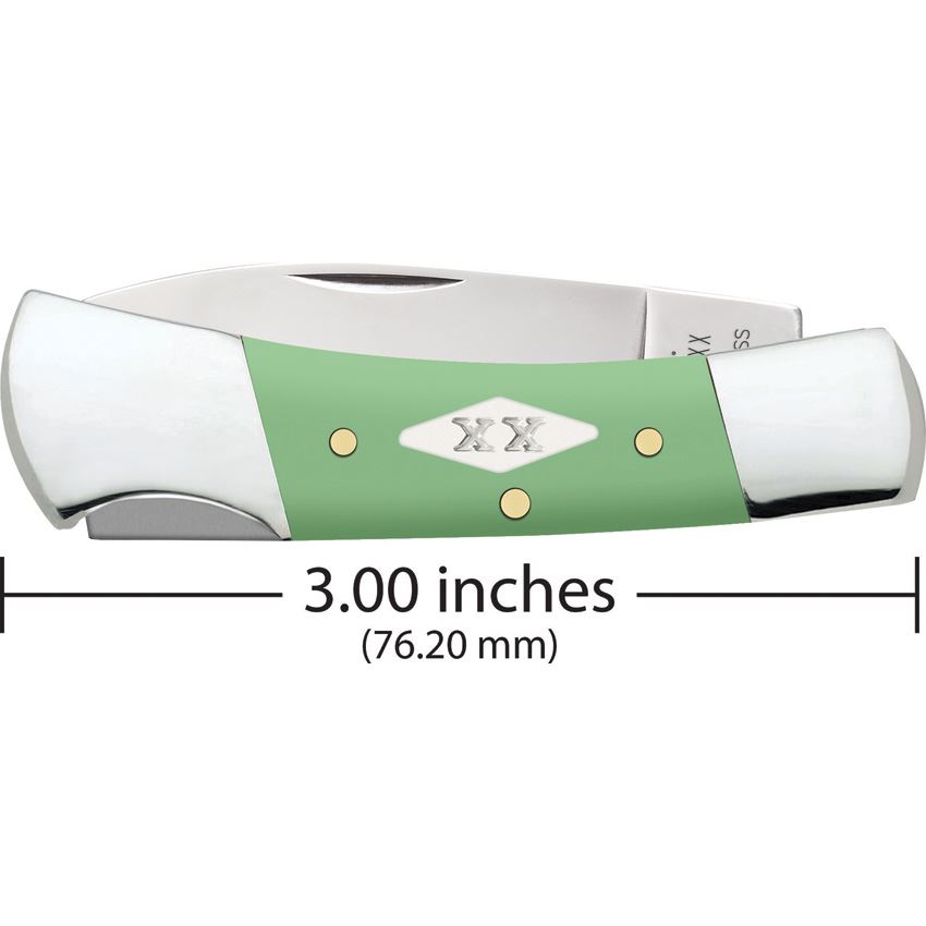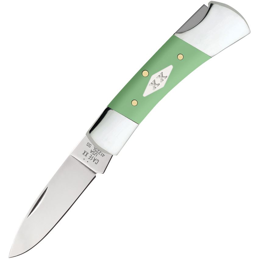Model/Item/Part Number - CA63836. Case XX Lockback Mint Green. 41225L SS pattern. 3" (7.62cm) closed. Mirror finish stainless drop point blade. Mint Green smooth synthetic handle. Nickel silver bolster(s). Inlay shield. Boxed. Made in USA.