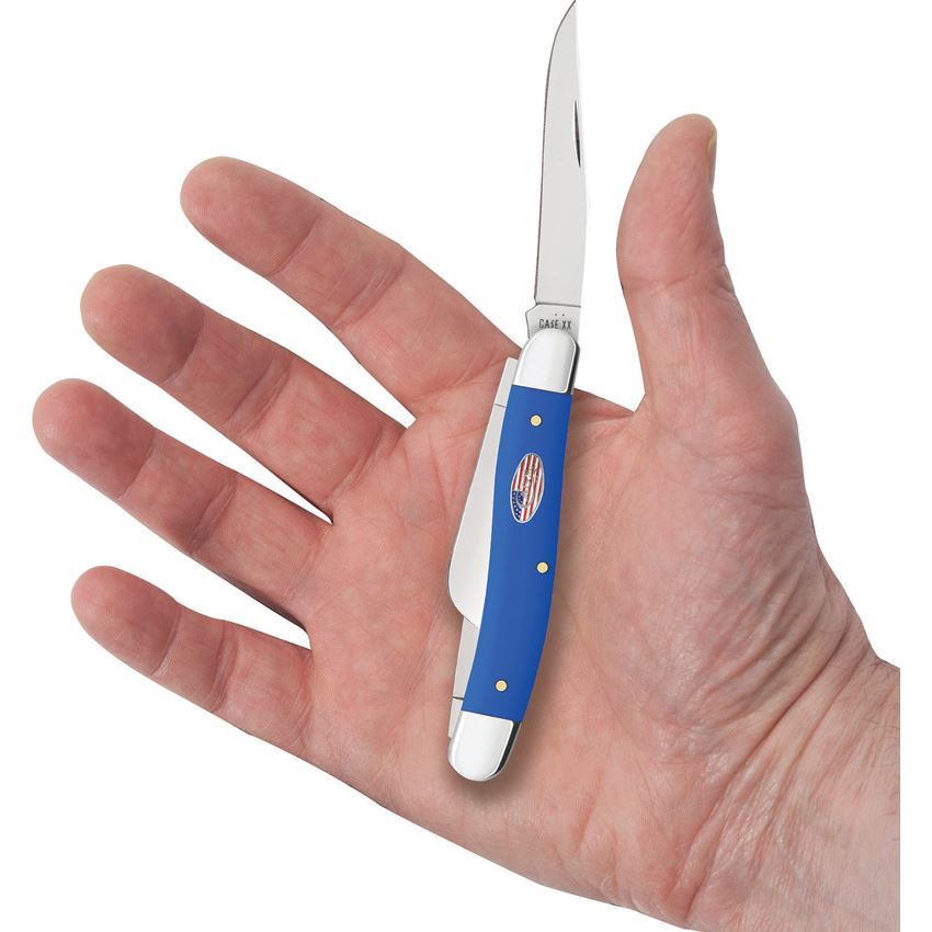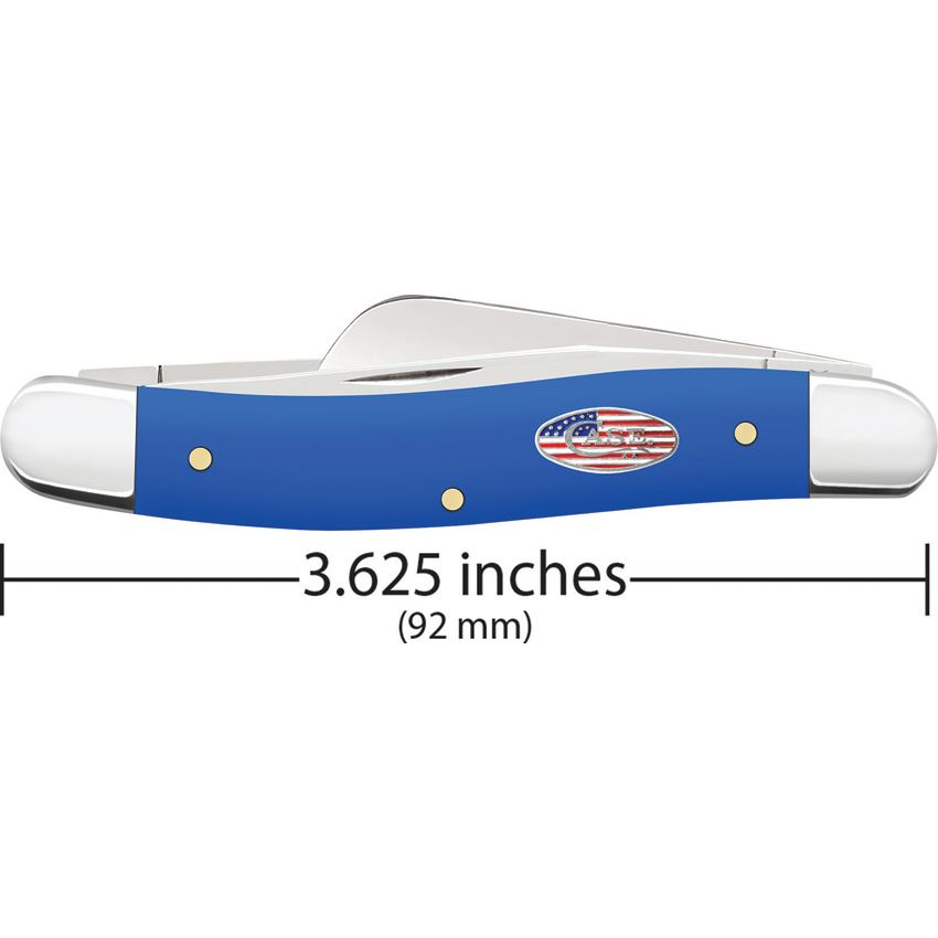 Model/Item/Part Number - CA16402. Case XX Med Stockman Royal Blue. 4318 SS pattern. 3.63" (9.22cm) closed. Mirror finish stainless clip, sheepsfoot, and spey blades. Royal blue smooth synthetic handle. Nickel silver bolster(s). Inlay shield. Boxed. Made in USA.
