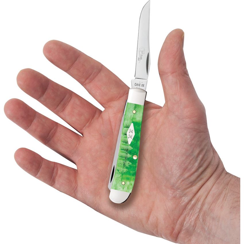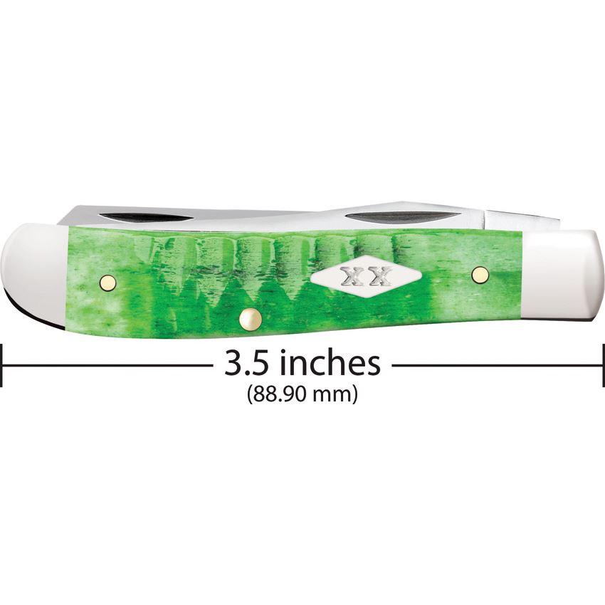 Model/Item/Part Number - CA81441. Case XX Mini Trapper Grn Gator 1st Pro. 6207 SS pattern. 3.5" (8.89cm) closed. Mirror finish stainless clip and spey blades. Green Gator jigged bone handle. Nickel silver bolster(s). Inlay shield. First Production Run. Boxed. Made in USA.
