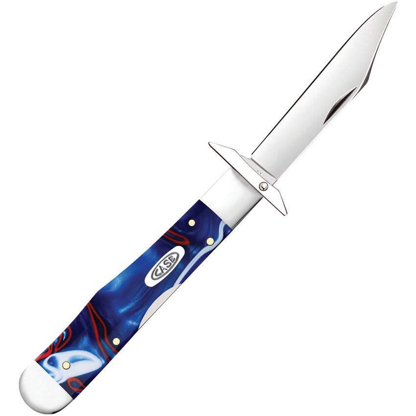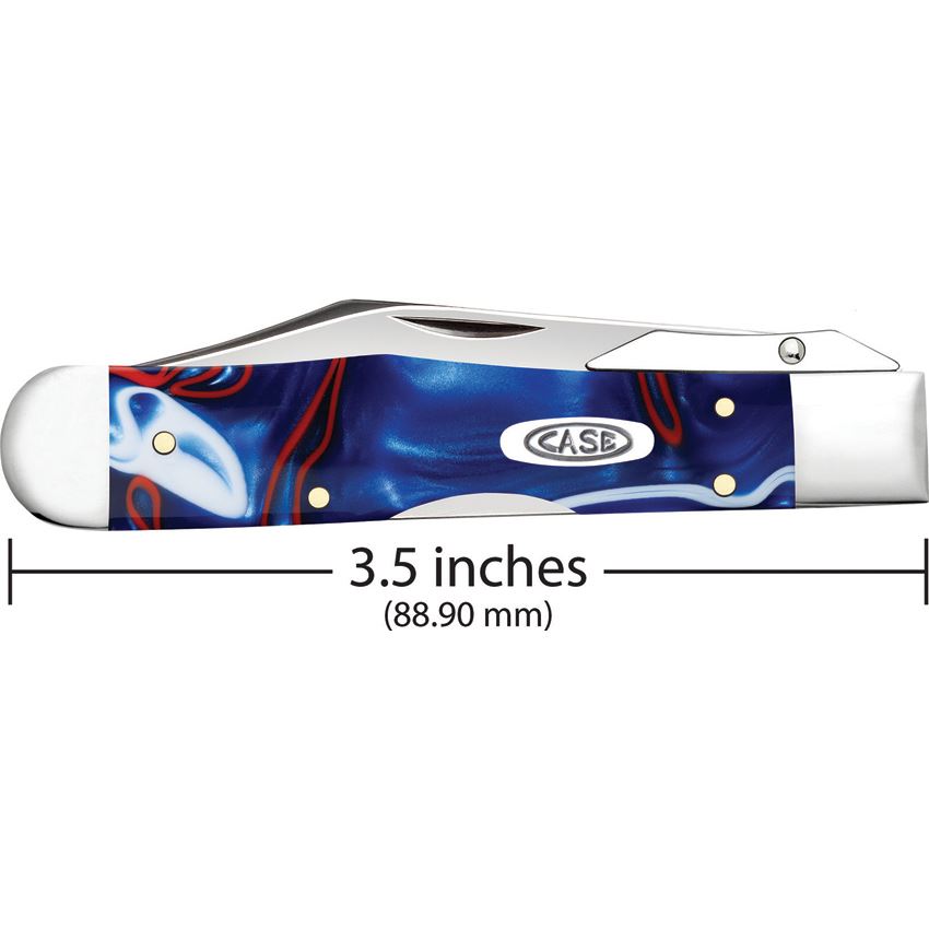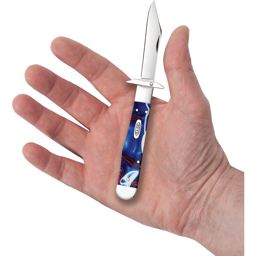 Model/Item/Part Number - CA11230. Case XX Cheetah Cub Lockback Patriotic. 1011 1/2L SS pattern. 3.5" (8.89cm) closed. Mirror finish stainless locking clip blade with swing guard. Patriotic smooth Kirinite handle. Nickel silver bolster(s). Inlay shield. Boxed. Made in USA.
