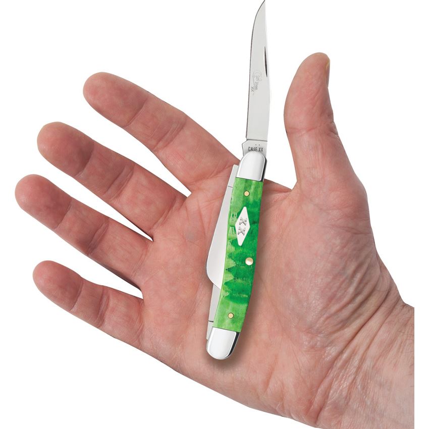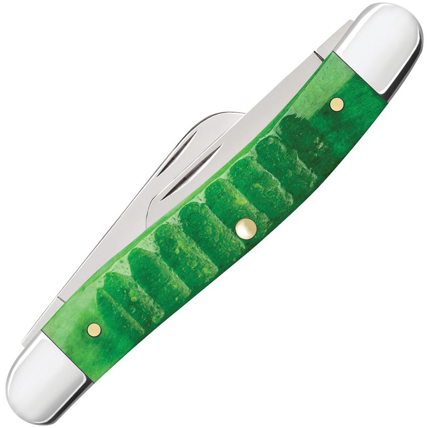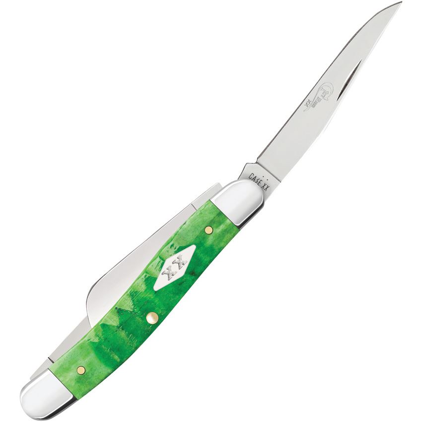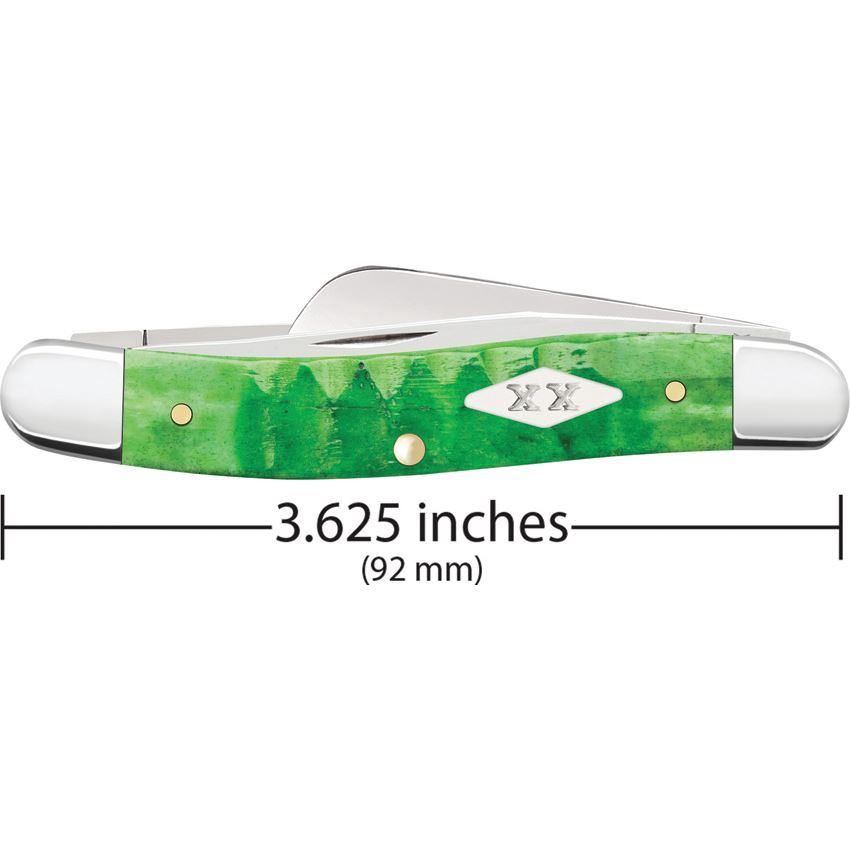 Model/Item/Part Number - CA81442. Case XX Md Stockman Grn Gator 1st Pro. 6318 SS pattern. 3.63" (9.22cm) closed. Mirror finish stainless clip, sheepsfoot, and spey blades. Green Gator jigged bone handle. Nickel silver bolster(s). Inlay shield. Made in USA.