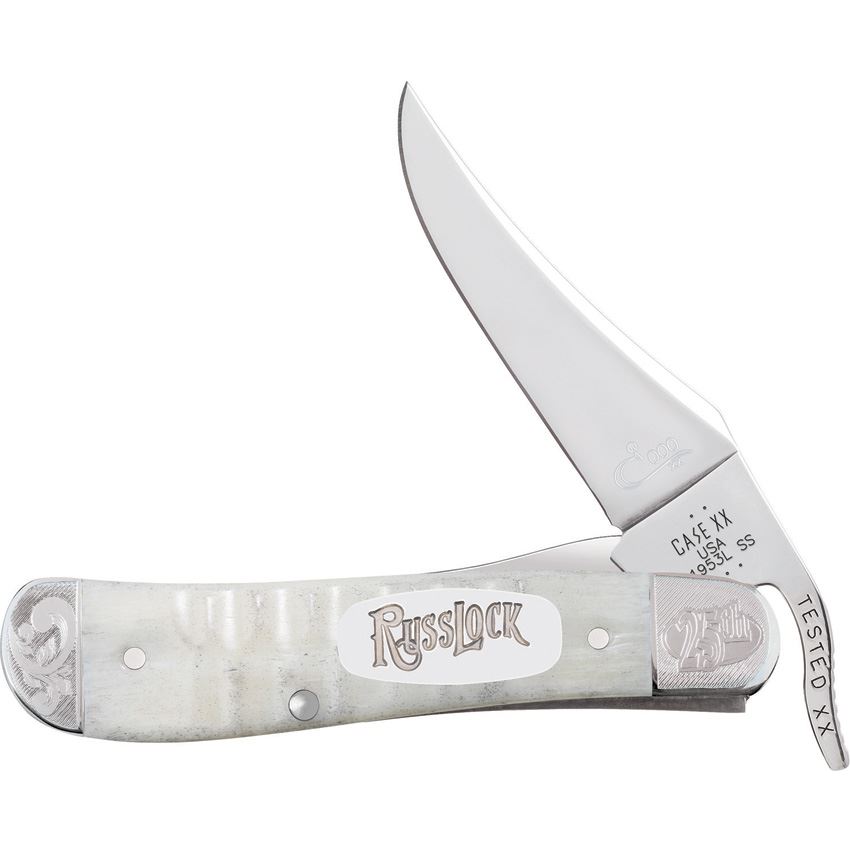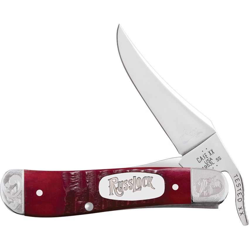 Model/Item/Part Number - CA52022. Case XX Russlock 25th Anniversary Set. 61953L SS pattern. 4.25" (10.8cm) closed. Mirror finish stainless clip blade. Extended tang. Inlay shield. Set of 3 knife handles: Gator Jig Dark Red Bone, Natural Bone, Navy Blue Bone. Scrolled bolsters. Illuminated dome natural walnut display. Boxed. Made in USA.