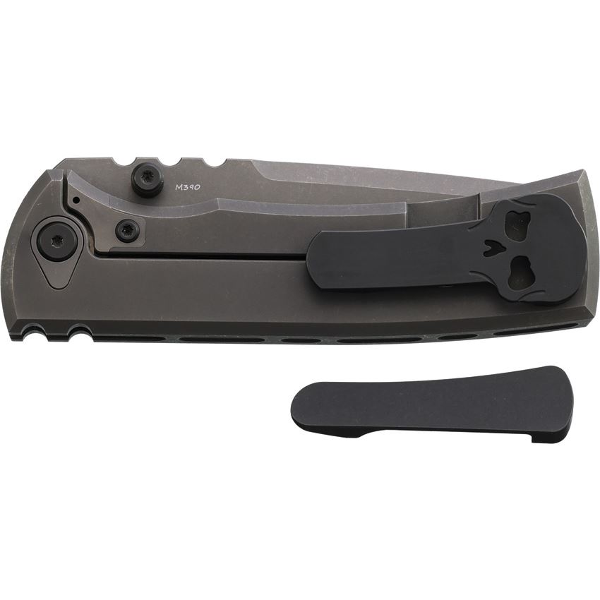 Model/Item/Part Number - CHAV14660. Chaves Redencion 229 Framelock Knife Mag. 4.5" (11.43cm) closed. 3.5" (8.89cm) gray PVD coated Bohler M390 stainless drop point blade. Gray PVD coated titanium handle with Gray PVD coated magnetic titanium inlay. Thumb stud. Comes with traditional and Chaves skull pocket clips. Hidden pocket clip screws and showside pivot. Boxed. Made in China.