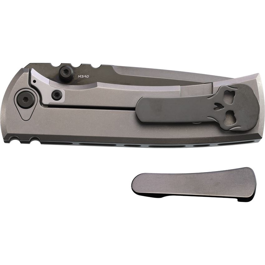 Model/Item/Part Number - CHAV14664. Chaves Redencion 229 Framelock Knife Mag. 4.5" (11.43cm) closed. 3.5" (8.89cm) black DLC coated Bohler M390 stainless drop point blade. Bright stonewash titanium handle with Bright stonewash magnetic titanium inlay. Thumb stud. Comes with traditional and Chaves skull pocket clips. Hidden pocket clip screws and showside pivot. Boxed. Made in China.