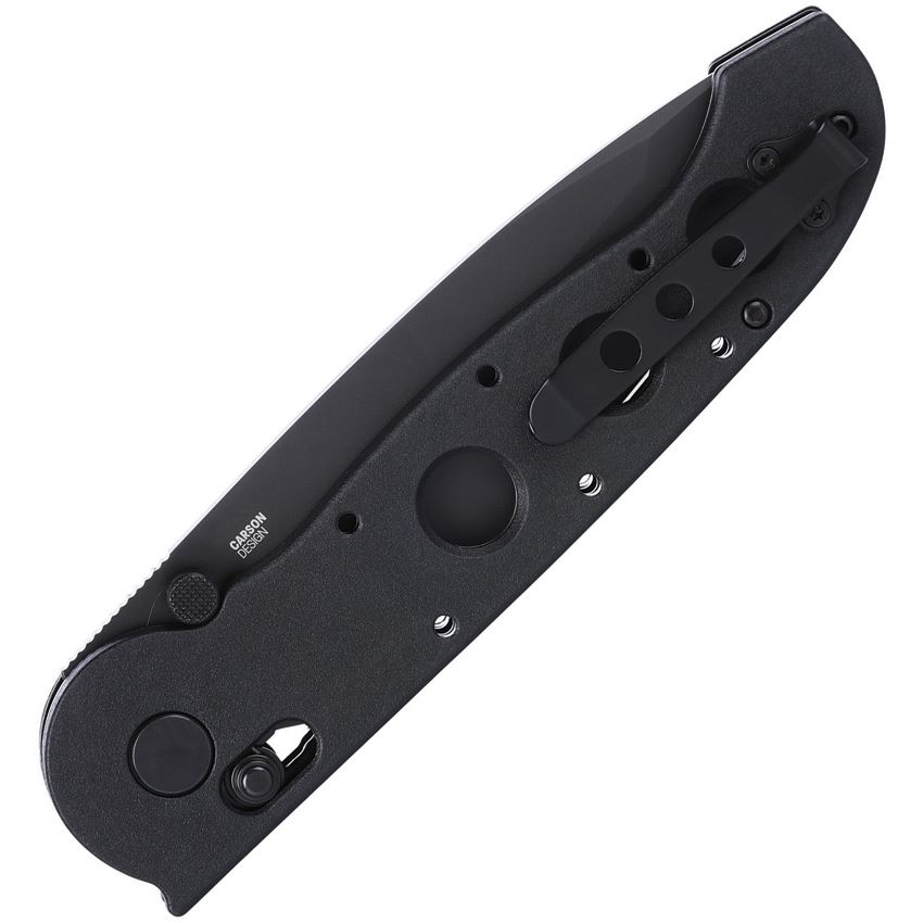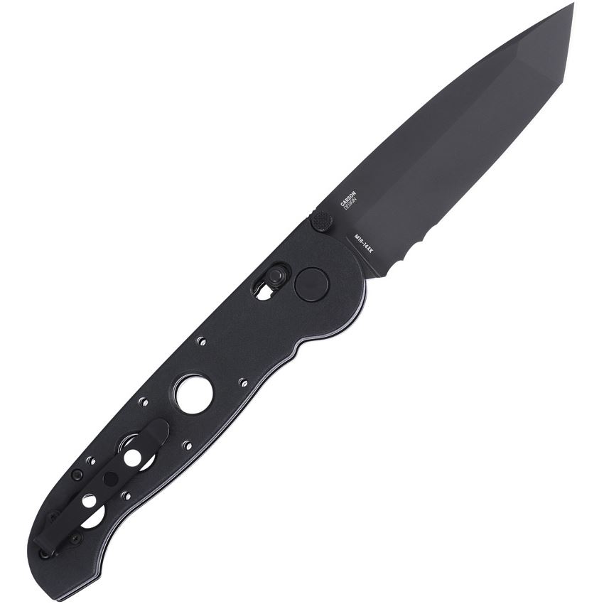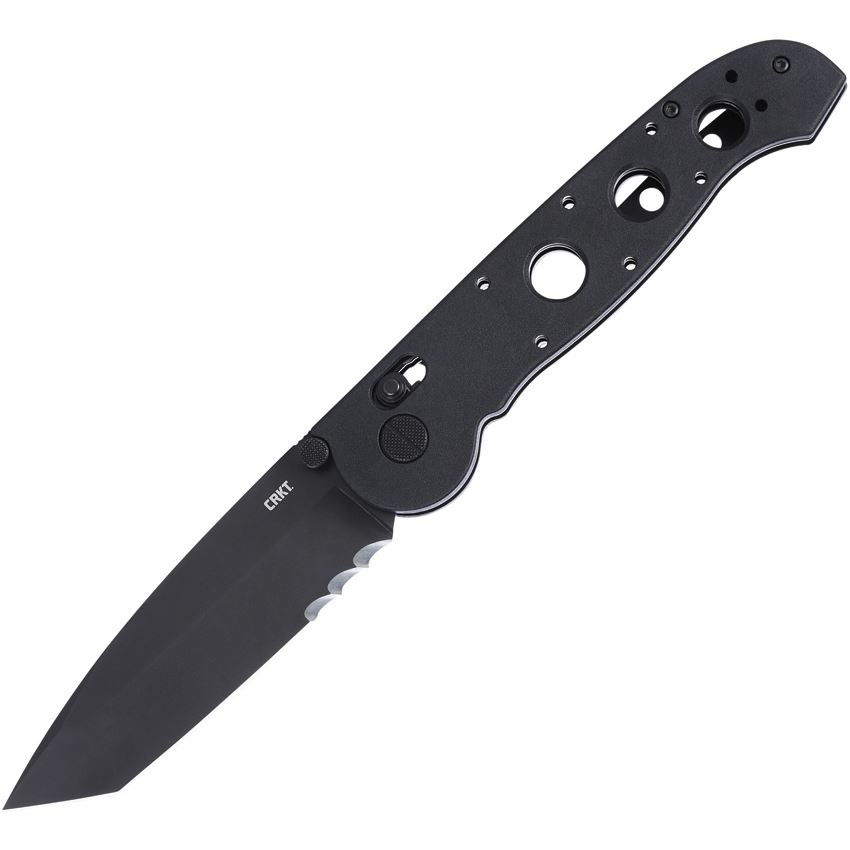 Model/Item/Part Number - CRM1614XK. CRKT M16-14XK Crossbar Lock Knife. 5.38" (13.67cm) closed. 4" (10.16cm) black oxide coated Veff serrated D2 tool steel tanto blade. Black Grivory handle. Thumb stud. Pocket clip. Boxed. Made in Taiwan.