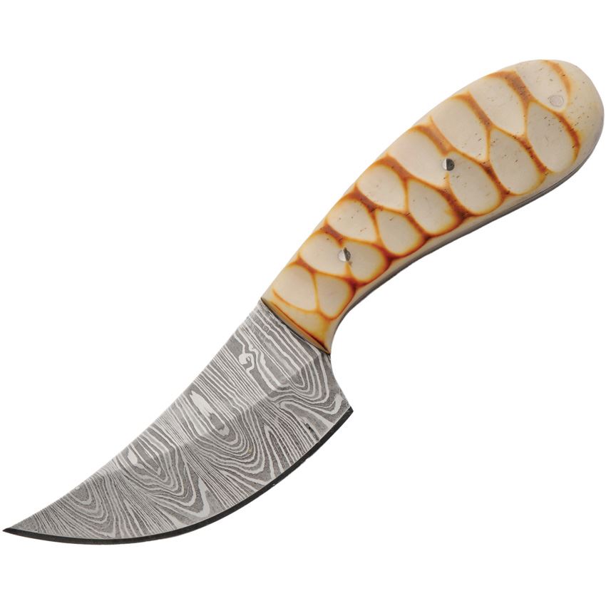 Model/Item/Part Number - DM1429BO. Damascus Skinner Burnt Bone. 6" (15.24cm) overall. 2.75" (6.99cm) Damascus steel skinner blade. Burnt sculpted bone handle. Full tang. Brown leather belt sheath. Boxed. Made in Pakistan.