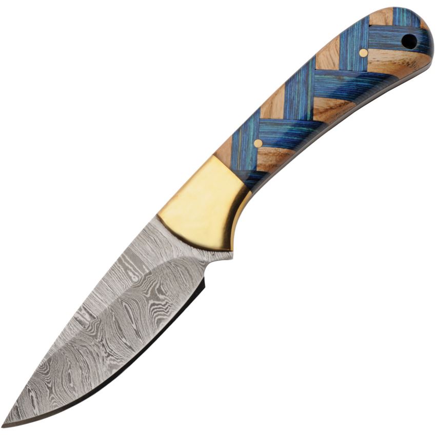 Model/Item/Part Number - DM1431. Damascus Braided Sapphire Skinner. 7" (17.78cm) overall. 3" (7.62cm) Damascus steel skinner blade. Blue and brown wood handle. Brass guard. Full tang. Lanyard hole. Brown leather belt sheath. Boxed. Made in Pakistan.
