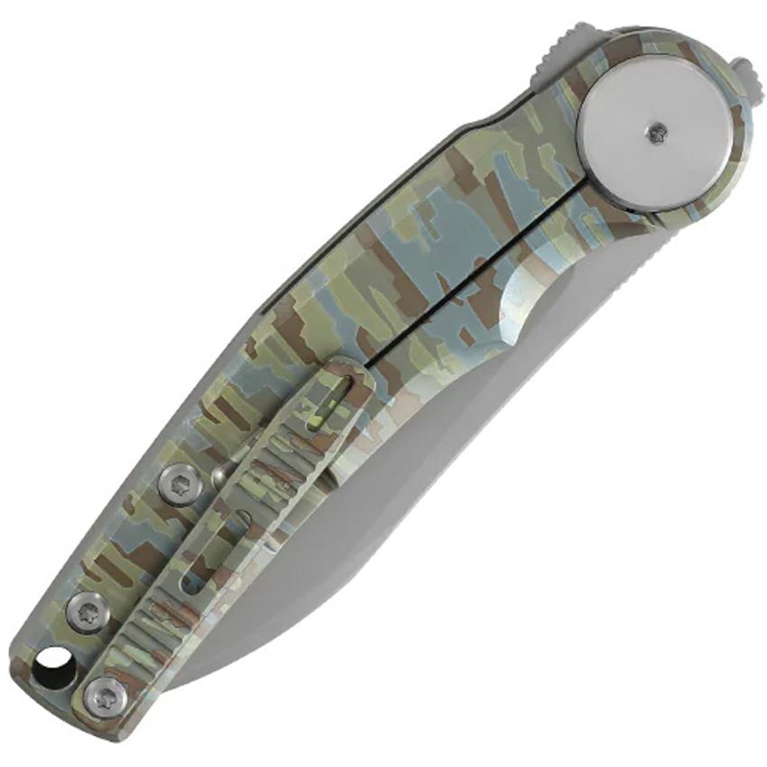 Model/Item/Part Number - DTK9618C. Dreamtech Framelock Knife Ti Camo. 4.25" (10.8cm) closed. 3.25" (8.26cm) bead blast finish Bohler M390 stainless reverse tanto blade. Camo titanium handle. Extended tang. Pocket clip. Lanyard hole. Black synthetic zippered storage case. Boxed. Made in China.