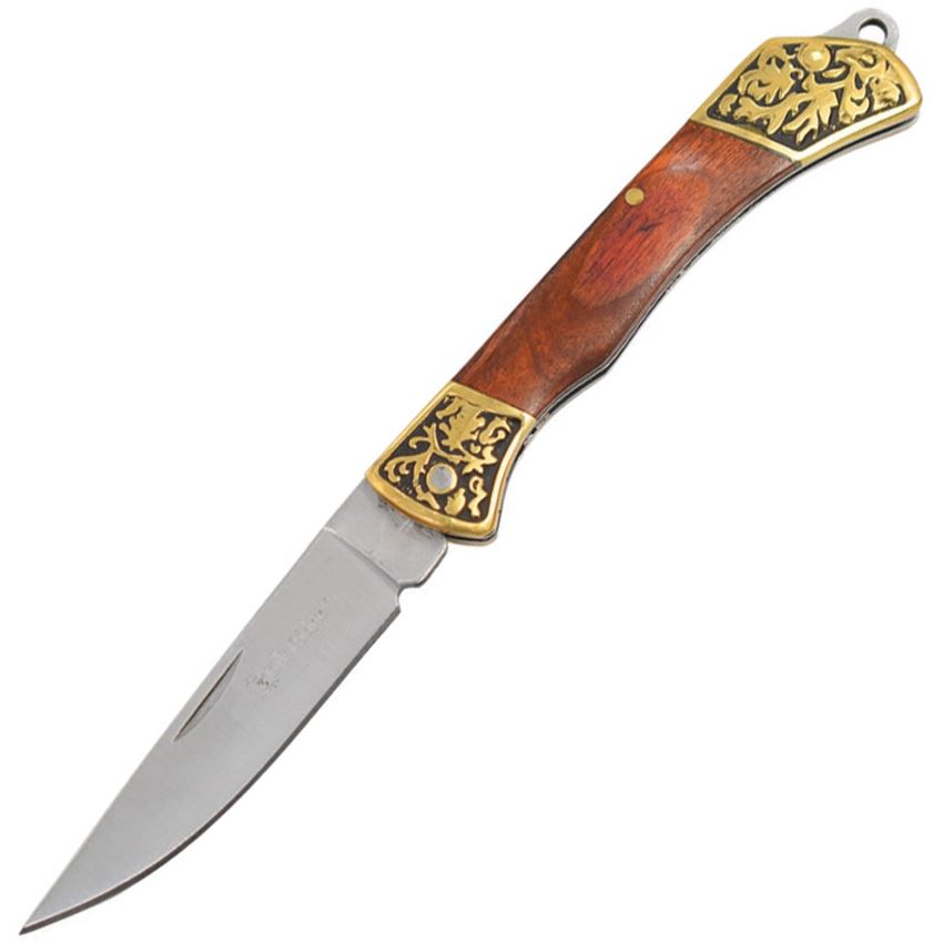 Model/Item/Part Number - ER2023RD. Elk Ridge Slip Joint Wood. 3" (7.62cm) closed. 2.25" (5.72cm) satin finish stainless drop point blade. Brown wood handle. Brass bolster(s). Lanyard hole. Slip joint. Boxed. Made in China.
