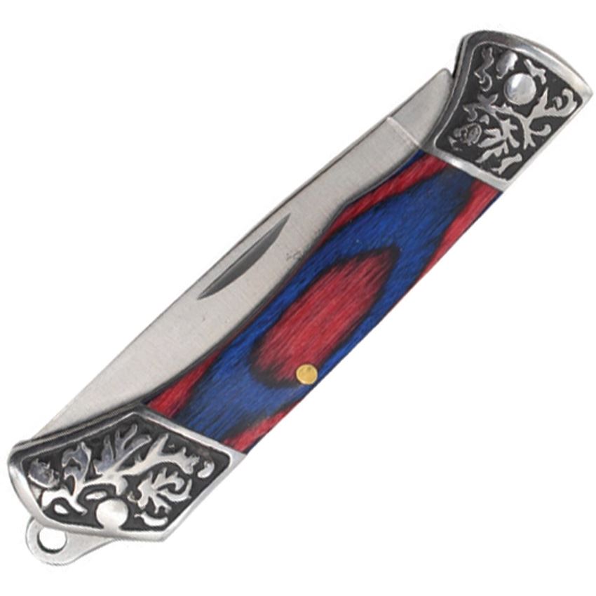 Model/Item/Part Number - ER2024BL. Elk Ridge Slip Joint Blue/Red. 3" (7.62cm) closed. 2.25" (5.72cm) satin finish stainless drop point blade. Blue and red wood handle. Stainless bolster(s). Lanyard hole. Slip joint. Boxed. Made in China.