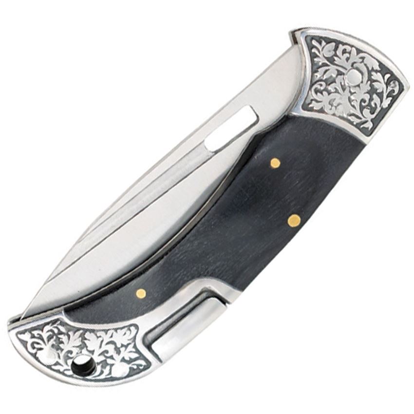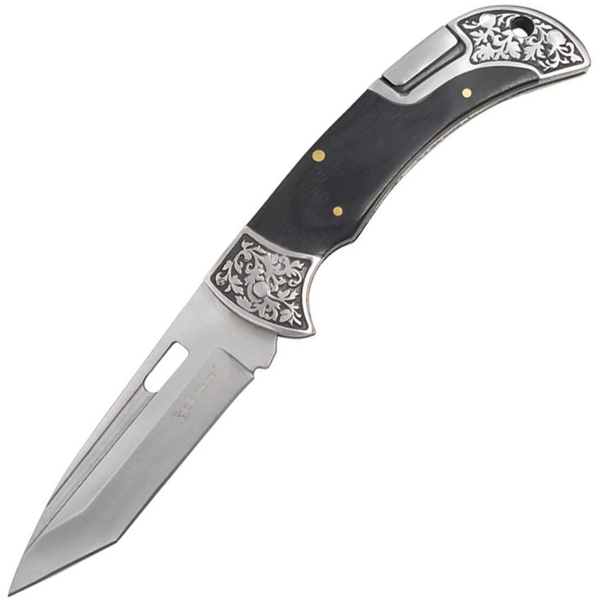 Model/Item/Part Number - ER2028GY. Elk Ridge Lockback Gray. 4.5" (11.43cm) closed. 3.5" (8.89cm) satin finish stainless tanto blade. Dark gray wood handle. Thumb pull. Stainless bolster(s). Lanyard hole. Boxed. Made in China.