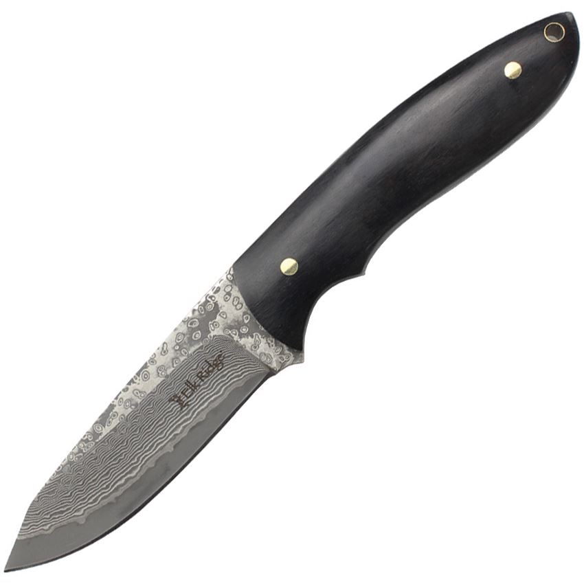 Model/Item/Part Number - ERFIX119DM. Elk Ridge Fixed Blade Knife. 8" (20.32cm) overall. 3.75" (9.53cm) Damascus steel drop point blade. Black wood handle. Full tang. Lanyard hole. Brown leather belt sheath. Boxed. Made in China.
