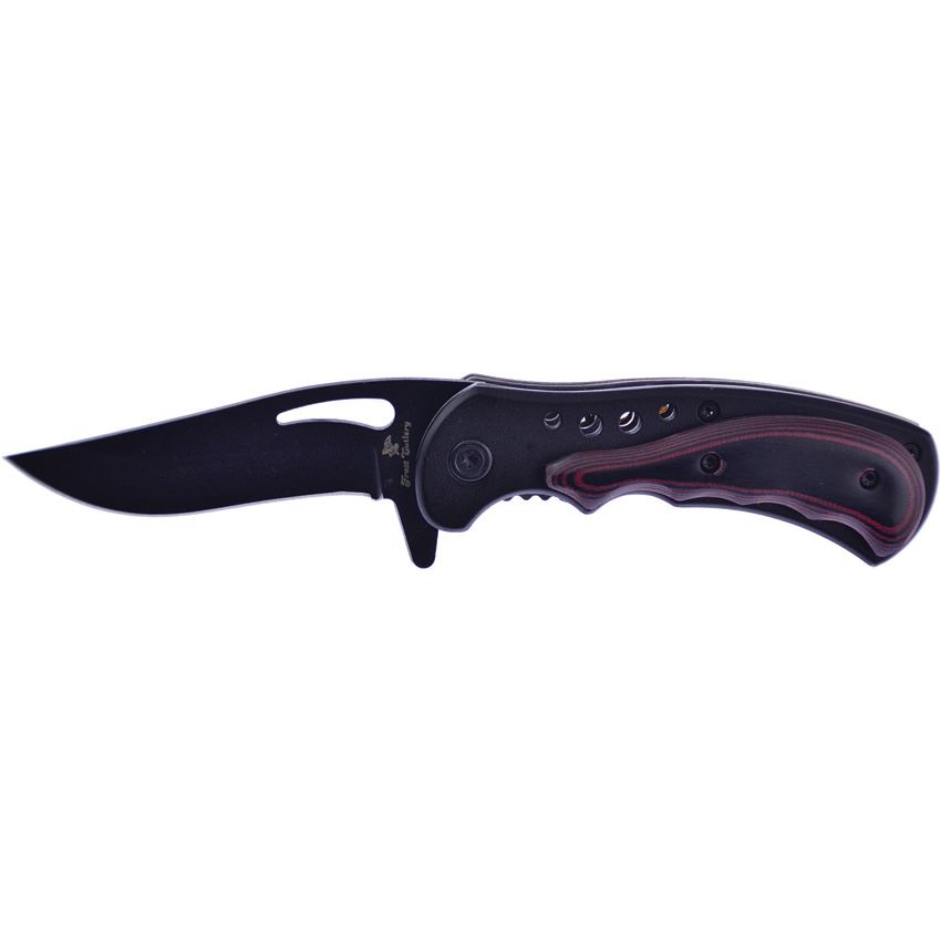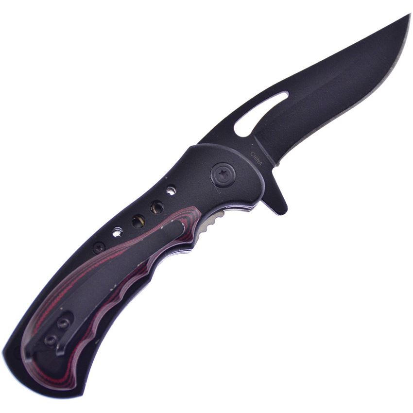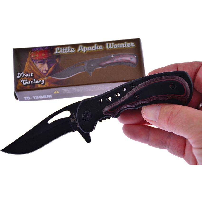 Model/Item/Part Number - F15138RM. Frost Little Apache Warrior Assist Open mic. Assisted opening. 3.88" (9.86cm) closed. 2.63" (6.68cm) black finish stainless clip point blade. Black stainless handle with Black and red micarta onlay. Extended tang. Thumb pull. Pocket clip. Boxed. Made in China.