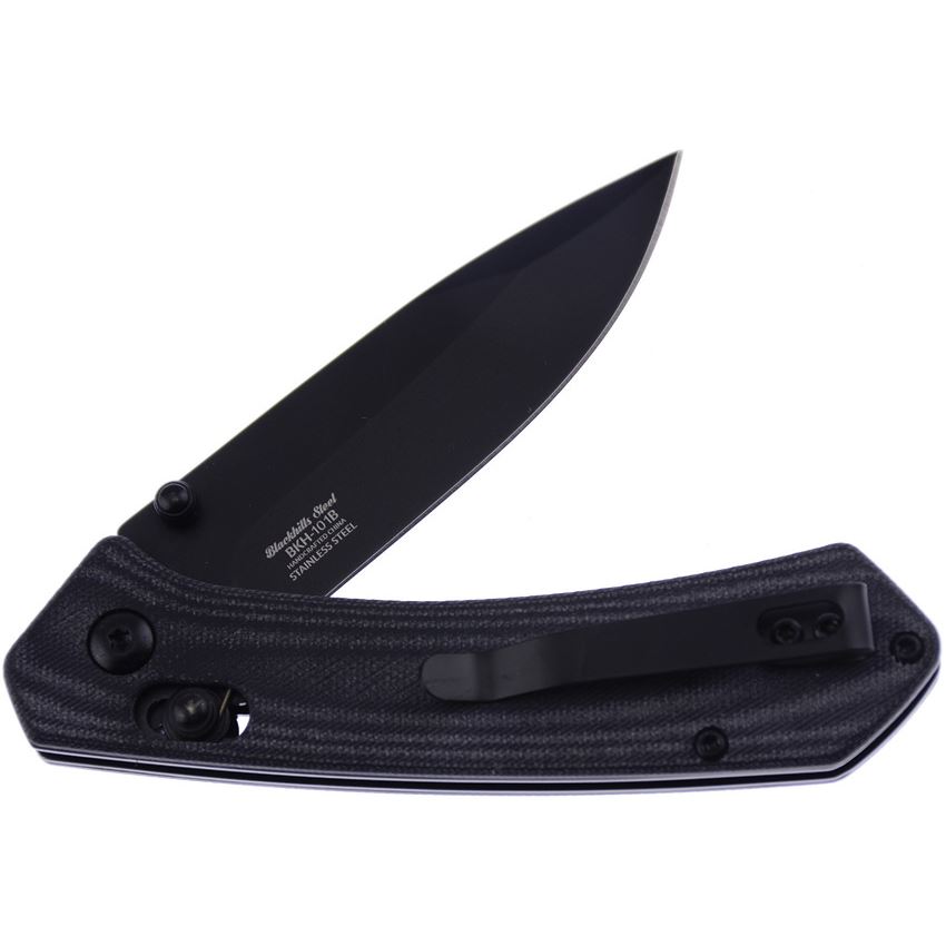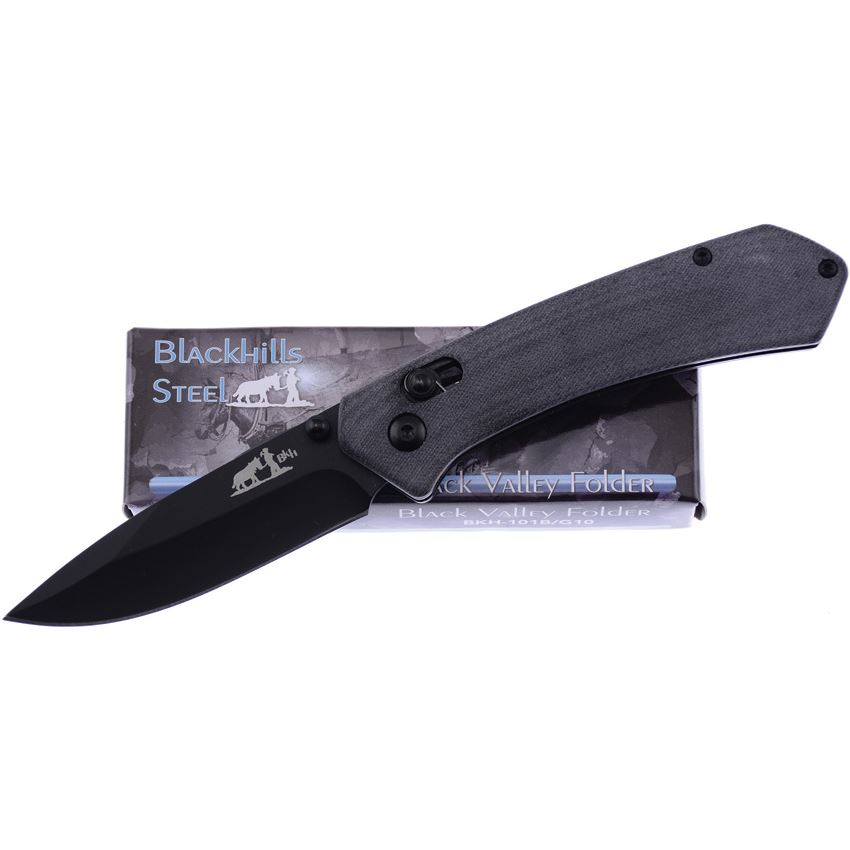 Model/Item/Part Number - FBKH101BG10. Frost Black Valley Crossbar Lock Knife. 4.25" (10.8cm) closed. 3" (7.62cm) black finish stainless drop point blade. Black G10 handle. Thumb stud. Pocket clip. Boxed. Made in China.