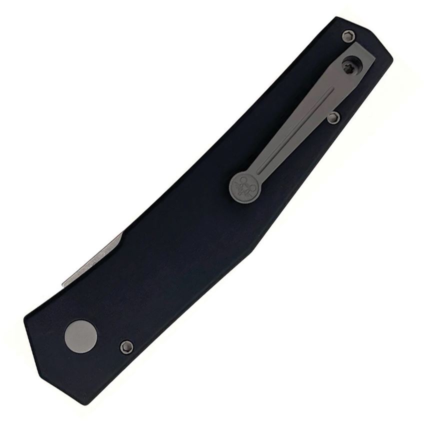 Model/Item/Part Number - GM13044. Giant Mouse Auto ACE Elmer Button Lock Blk. 4.5" (11.43cm) closed. 3.25" (8.26cm) stonewash finish CPM MagnaCut stainless blade. Black aluminum handle. Pocket clip. Boxed. Made in USA.