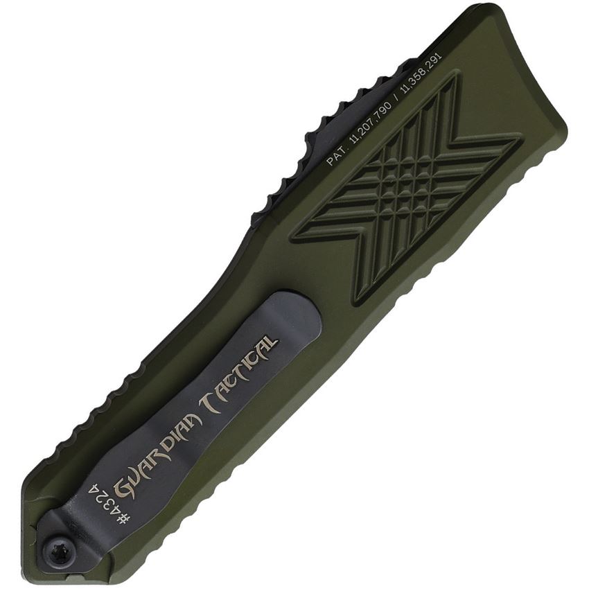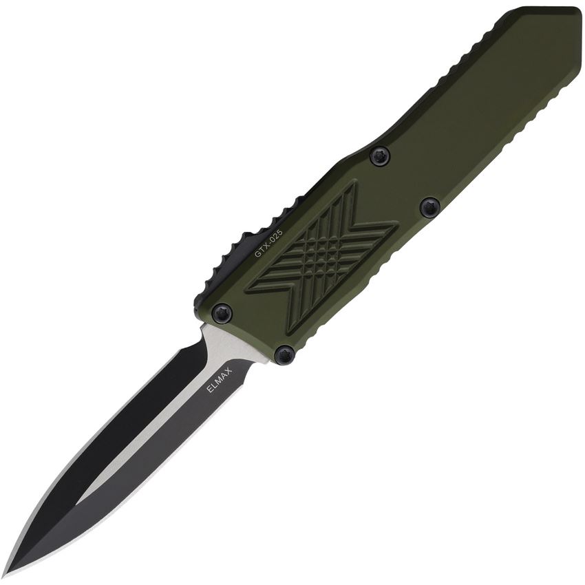 Model/Item/Part Number - GT128231. Guardian Tactical Auto GTX025 OTF OD DE. Automatic opening. 4" (10.16cm) closed. 2.5" (6.35cm) two-tone finish double edge Elmax steel dagger blade. OD green aluminum handle. Glass breaker. Pocket clip. Boxed. Made in USA.