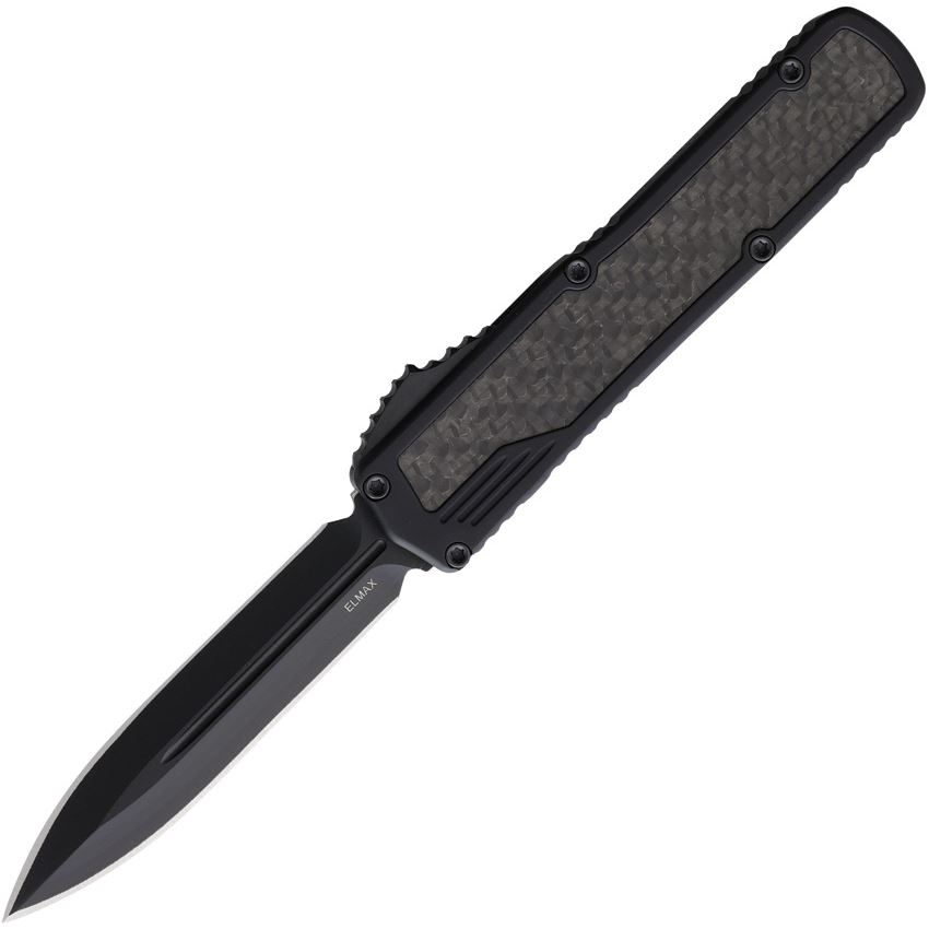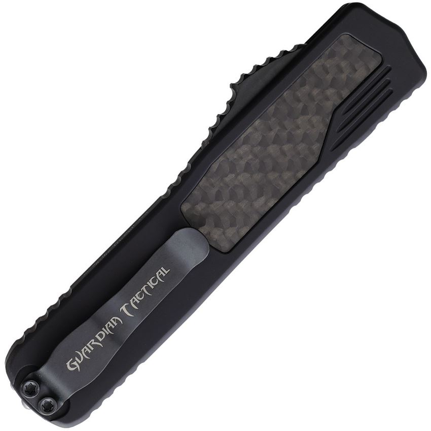 Model/Item/Part Number - GT142131BLKCF. Guardian Tactical Auto Scout D/E OTF CF Black. Automatic opening. 4.5" (11.43cm) closed. 3.5" (8.89cm) black coated double edge Elmax steel dagger blade. Black aluminum handle with carbon fiber inlay. Pocket clip. Boxed. Made in USA.