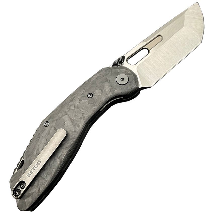 Model/Item/Part Number - KETM098. Ketuo Yakuza Linerlock Knife CF BK/SW. 4.5" (11.43cm) closed. 3.38" (8.59cm) black stonewash finish 154CM stainless tanto blade. Black marble carbon fiber handle. Thumb disk. Lanyard hole. Pocket clip. Thumb pull. Boxed. Made in China.