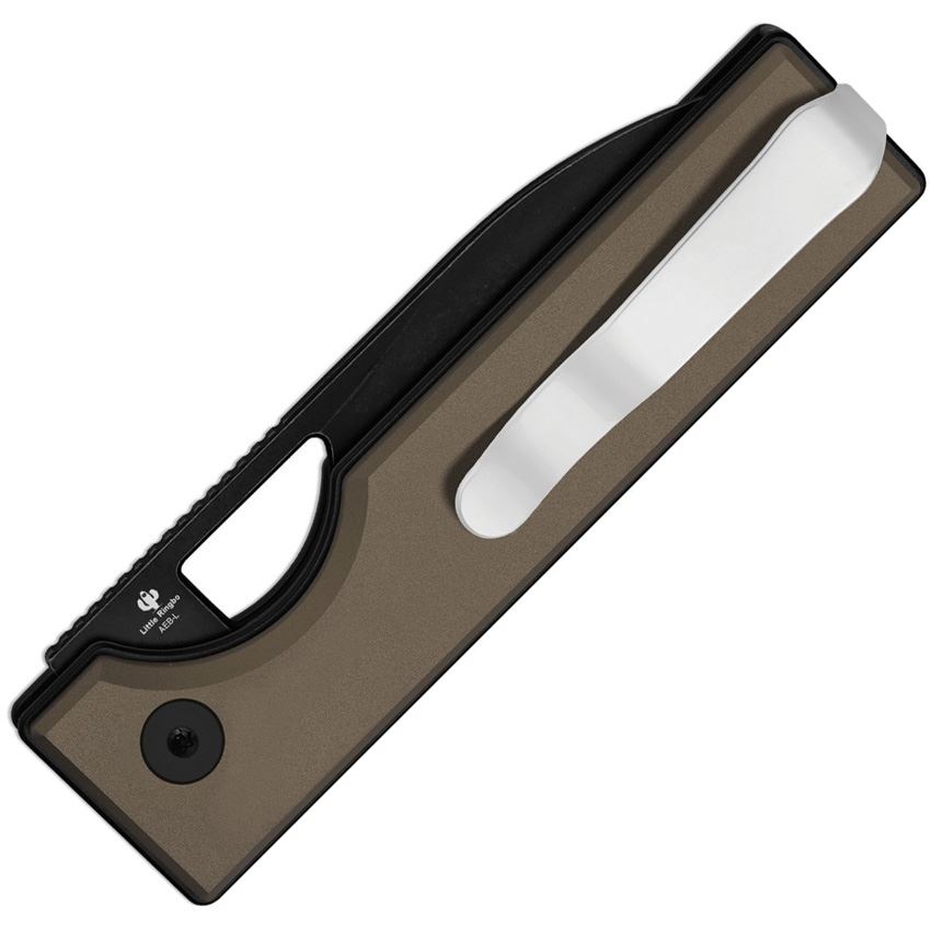 Model/Item/Part Number - KIV3708A2. Kizer Little Ringbo Button Linerlock Knife. 3.88" (9.86cm) closed. 2.88" (7.32cm) black stonewash finish AEB-L stainless drop point blade. Bronze aluminum handle. Thumb pull. Pocket clip. Boxed. Made in China.