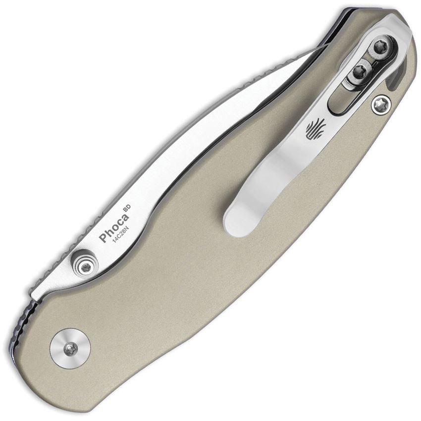 Model/Item/Part Number - KIV3781BDA2. Kizer Phoca BD Button Linerlock Knife Alm. 4.13" (10.49cm) closed. 3" (7.62cm) satin finish 14C28N Sandvik stainless drop point blade. Gray aluminum handle. Thumb stud. Lanyard hole. Pocket clip. Boxed. Made in China.