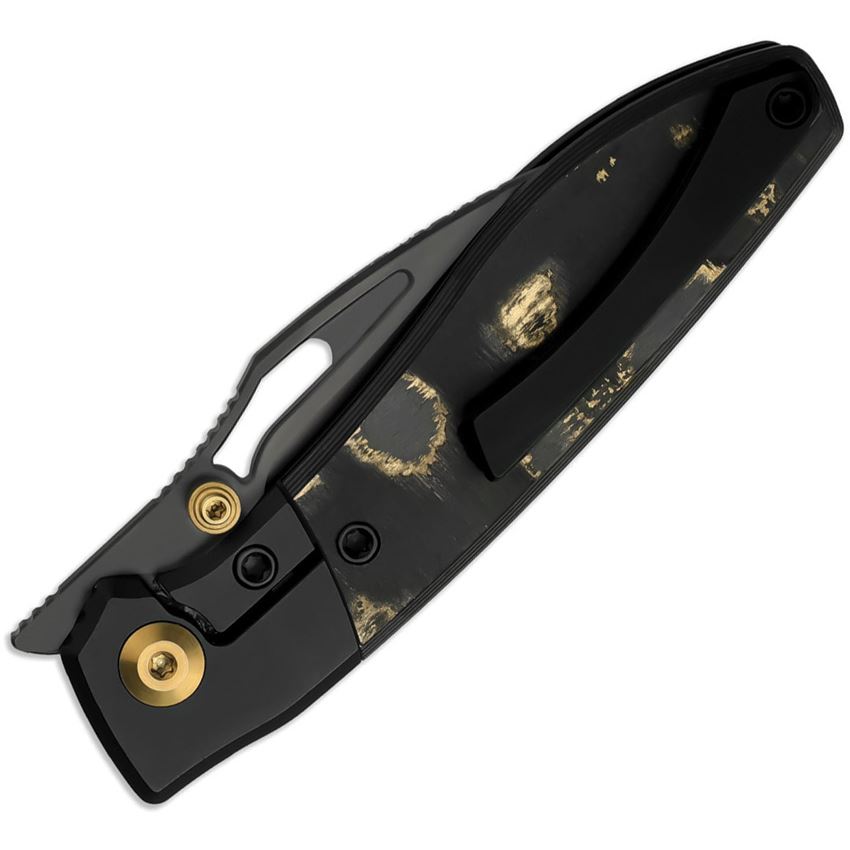 Model/Item/Part Number - KI3746A2. Kizer Shrike Framelock Knife Camo Gold CF. 3.63" (9.22cm) closed. 2.75" (6.99cm) black DLC coated S45VN stainless drop point blade. Black DLC coated titanium handle with Camo Gold Fat carbon fiber inlay. Thumb stud. Thumb pull. Pocket clip. Boxed. Made in China.