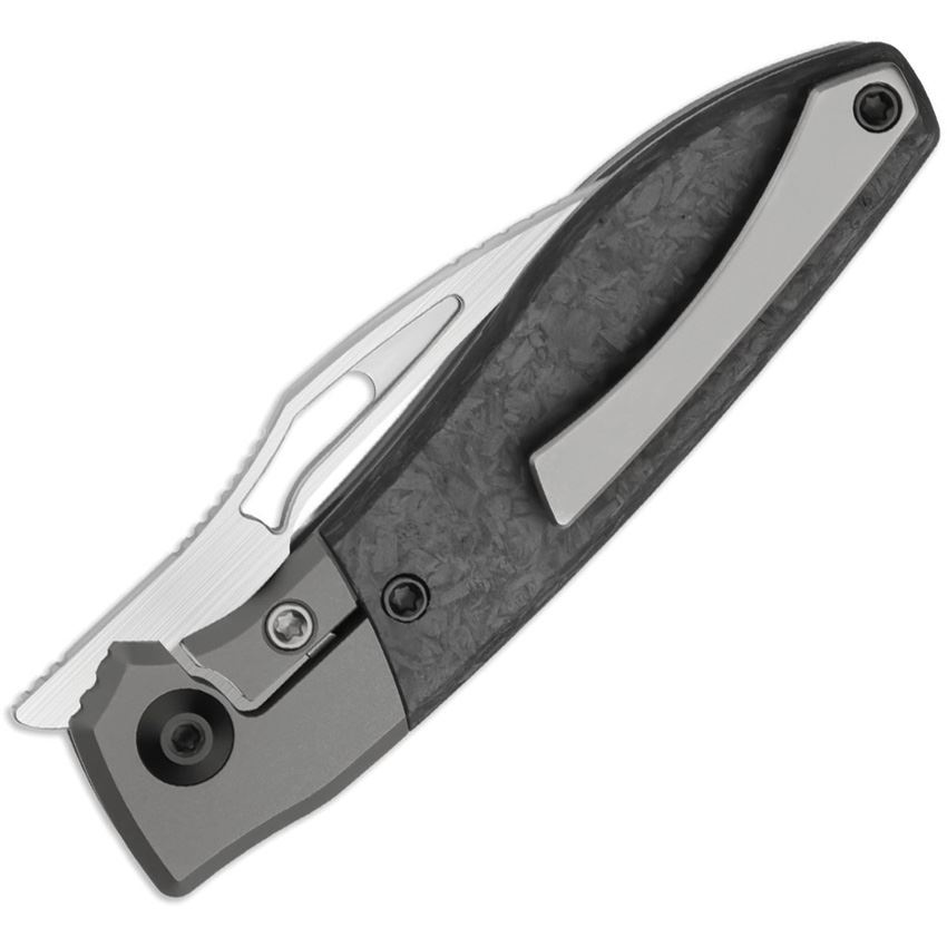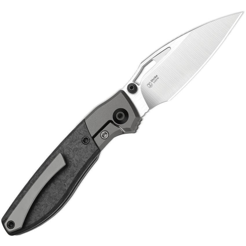 Model/Item/Part Number - KI3746A1. Kizer Shrike Framelock Knife CF. 3.63" (9.22cm) closed. 2.75" (6.99cm) brushed finish S45VN stainless drop point blade. Dark gray titanium handle with carbon fiber inlay. Thumb stud. Thumb pull. Pocket clip. Boxed. Made in China.