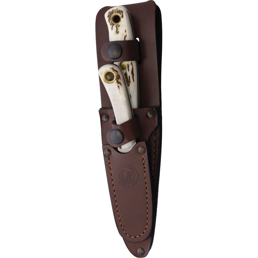 Model/Item/Part Number - KOA00375FG. Knives Of Alaska Alpha Wolf/Muskrat Combo. Bead blast finish MagnaCut steel blade. Stag handle. Full tang. Lanyard hole. Includes: 8" overall alpha wolfe with 3" blade; 6.5" overall muskrat with 2.25" blade with sharpened top edge. Brown leather belt sheath. Boxed. Made in USA.